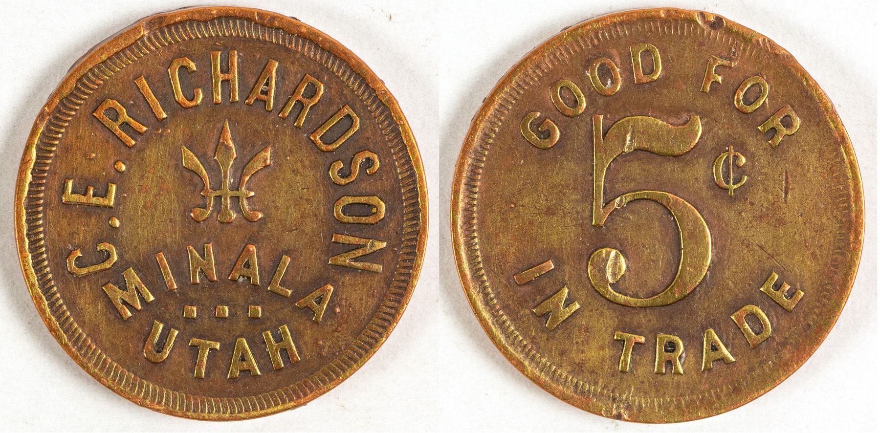 Obv.: C. E. Richardson / Minala / Utah; Rev.: Good For / 5c / In Trade. Rd.,br., 21 mm. Town name is spelled wrong. Extremely rare token according to Robert Campbell's "Utah Trade Tokens." State: Utah City: Manila Date: ID# 76452