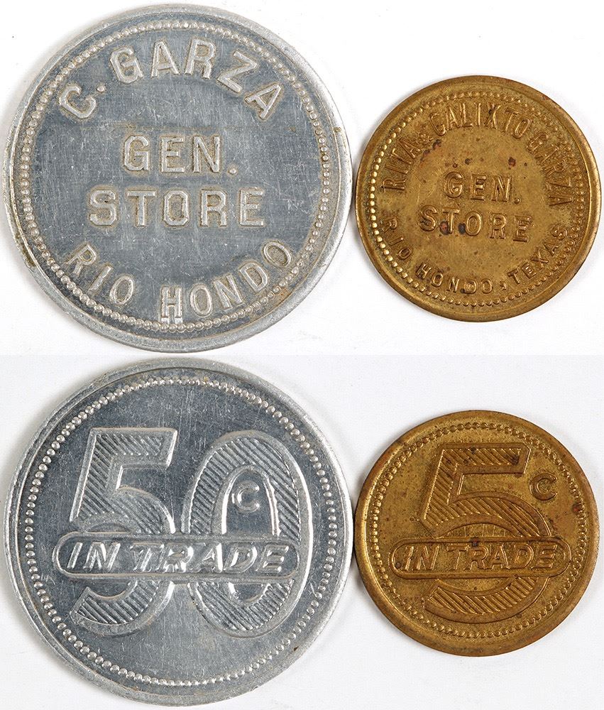 Round brass 23mm, RITA & CALIXTO GARZA / GEN. STORE / RIO HONDO, TEXAS // 5C IT. Round aluminum 32mm, C. GARZA / GEN. STORE / RIO HONDO // 50C IT. 3 merchant town. HWAC# 62544 Date: Location: Rio Hondo, Texas