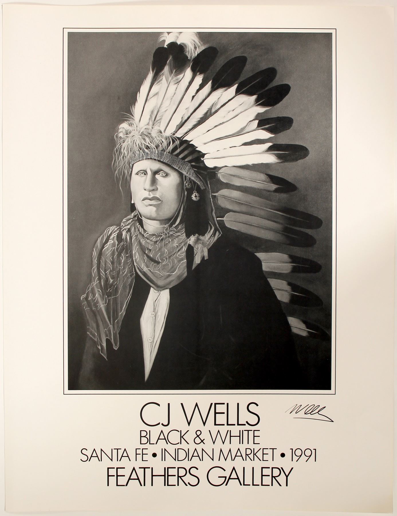 20" x 26.5". Beautiful poster in great condition. Signed by Wells. From the Feathers Gallery of Santa Fe Indian Market 1991, New Mexico. Ready to frame. Black & White poster.