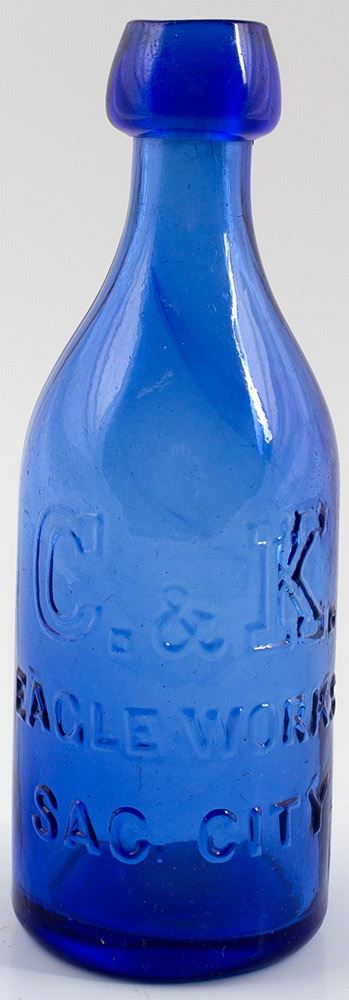 C. & K . / Eagle Works / Sac .City // 1858-1866: Medium Cobalt Blue. Looks like new, but has never been cleaned. No chips , cracks, or other issues. Nice darker striation, through the front shoulder. HWAC# 30063 Date: Location: Sacramento, California