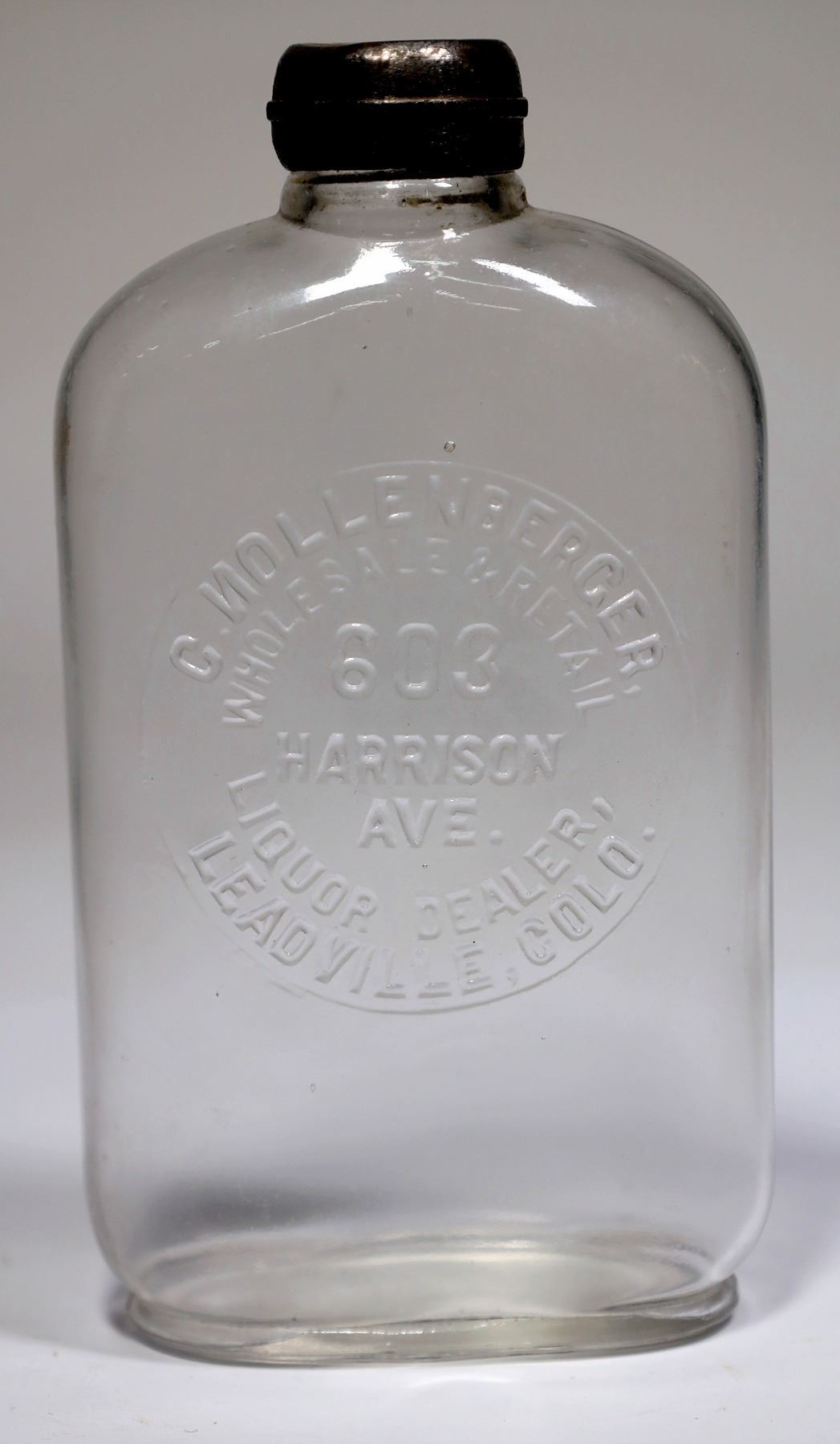 Preble W-115. This is the variety with a backwards "N" in the name. C. Nollenberger / Wholesale & Retail / 603 / Harrison / Ave. / Liquor Dealer / Leadville, Colo. 5.5", clear glass, ground top with metal cap. Haziness, ding above "G". Please inspect.