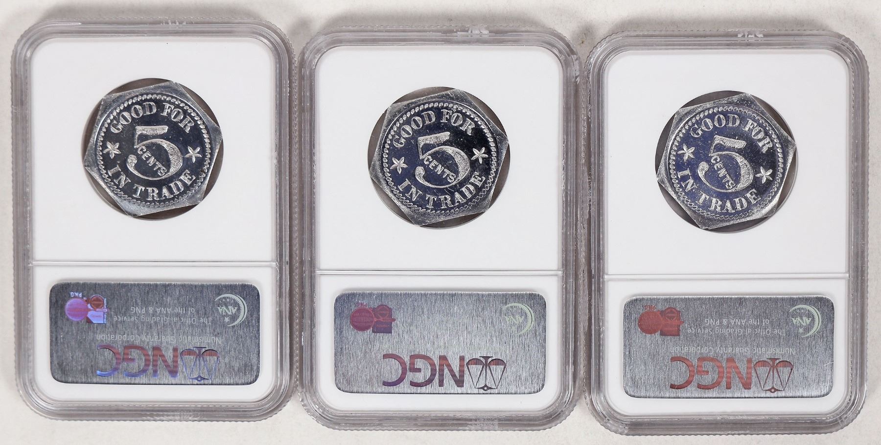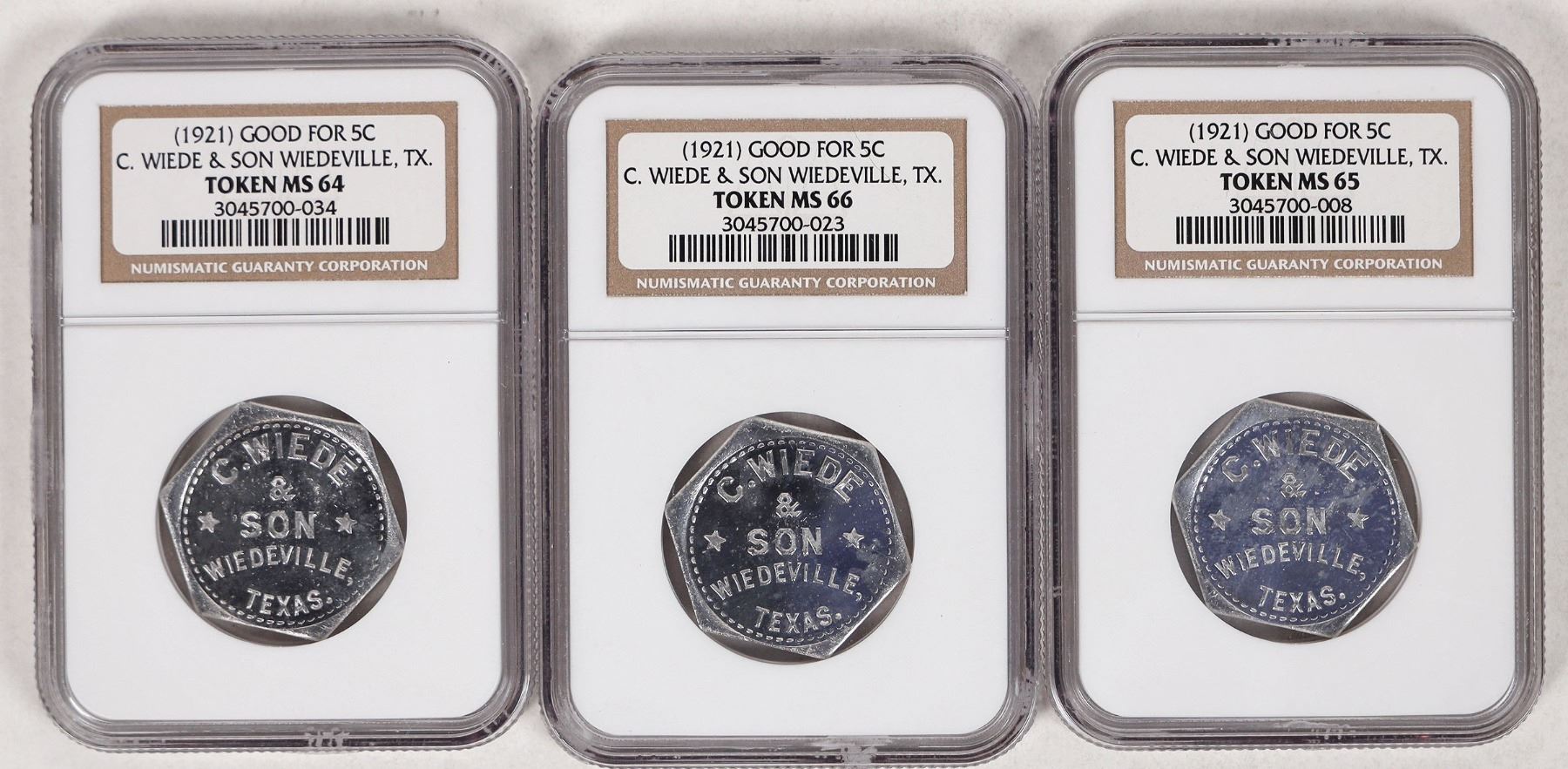 Can you tell the difference? NGC has graded these three tokens MS 64, MS 65 & MS 66. Host a grading seminar with these! C. WIEDE / & / SON / WIEDEVILLE, / TEXAS. // GOOD FOR / 5 CENTS / IN TRADE; Al., hexagonal, 26 mm.