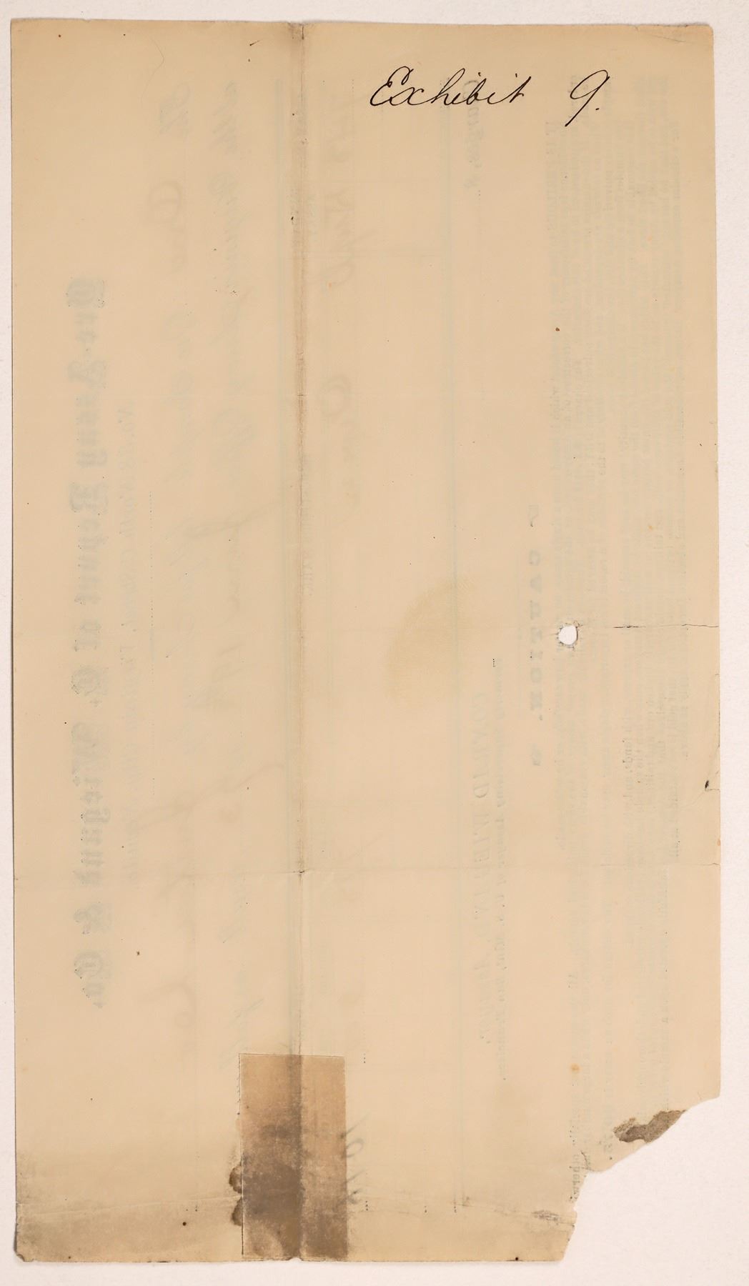 In addition to being extremely rare (possibly unique), this assay certificate tells an interesting story. It is for a deposit of low grade ore from the Justice Co. on June 18th, 1873 at the Virginia Assay Office branch for C. Wiegand & Co., located at No. 38 North C Street. (Wiegand also had an office in Gold Hill) This was a "duplicate" sample, used to check the assays being done and challenge the results. This is made even more evident given that the back of the form has "Exhibit 9" written; this was used in a court case! Blue print. Fold with archival tape repair. Missing one corner. 5.25 x 9" The Justice Mine was located in Silver City, one mile NW of Devil's Gate. In the mid 1870s, a vertical shaft was sunk to explore the lode at great depths (similar shafts were sunk at the same time in Virginia City and Gold Hill).