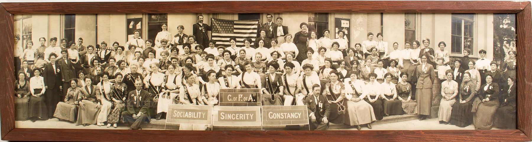 C of F of A (Companions Of The Forest Of America) Sociability, Sincerity, & Constancy. 34" panorama, circa 1915?. This group descended from the Ancient Order of Foresters in England. It took strength about 1900 in America. The fraternity is mostly women. We can't tell if this panorama is eastern or western, but came from a western collection. It is probably from an annual meeting, as each person has a breast badge, some with sashes, some with multiple pins. The piece has been professionally reframed and rebacked. Excellent condition, a great addition to any collector of Women's organizations. Date: Location: United States HWAC# 48437