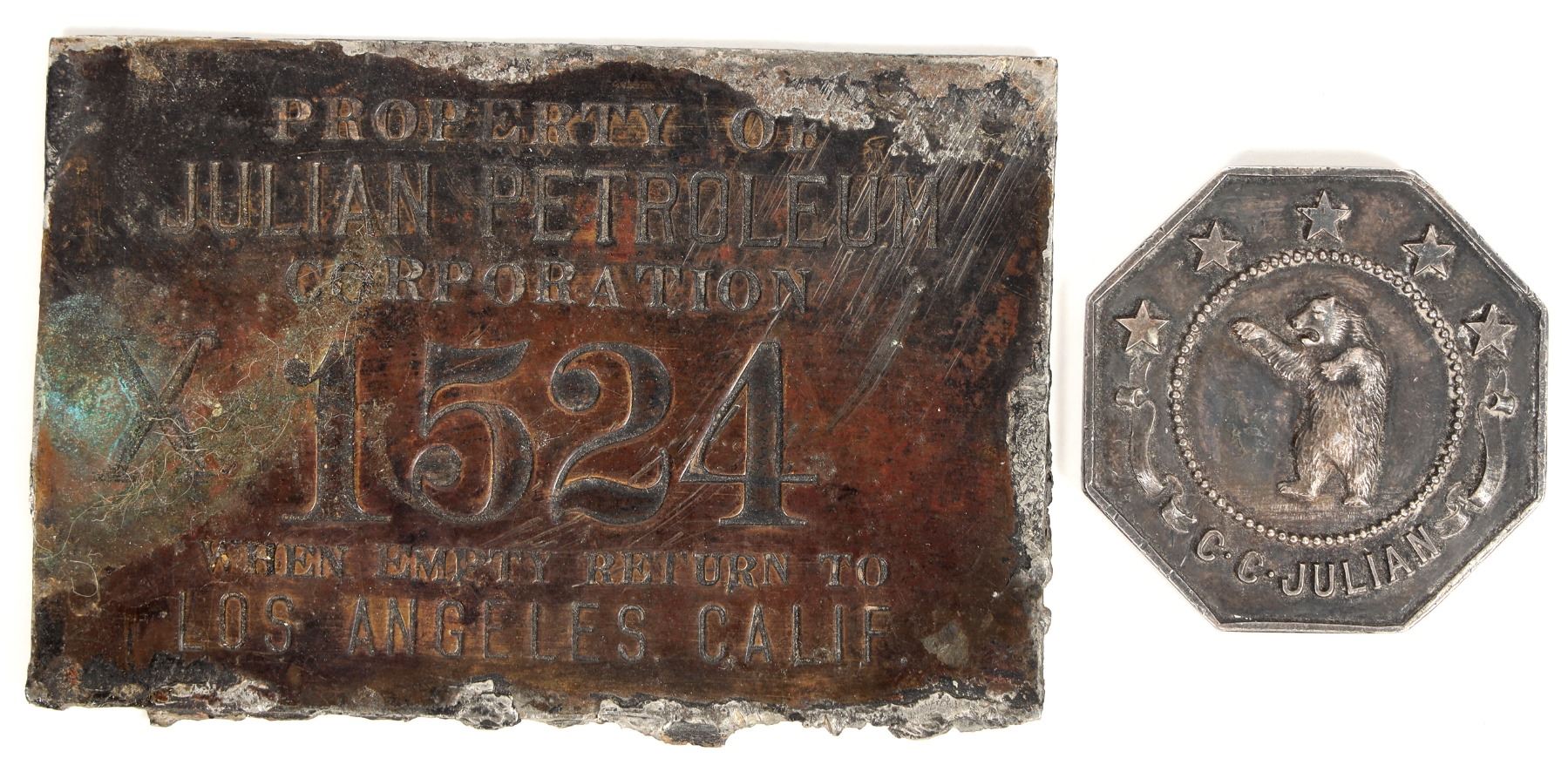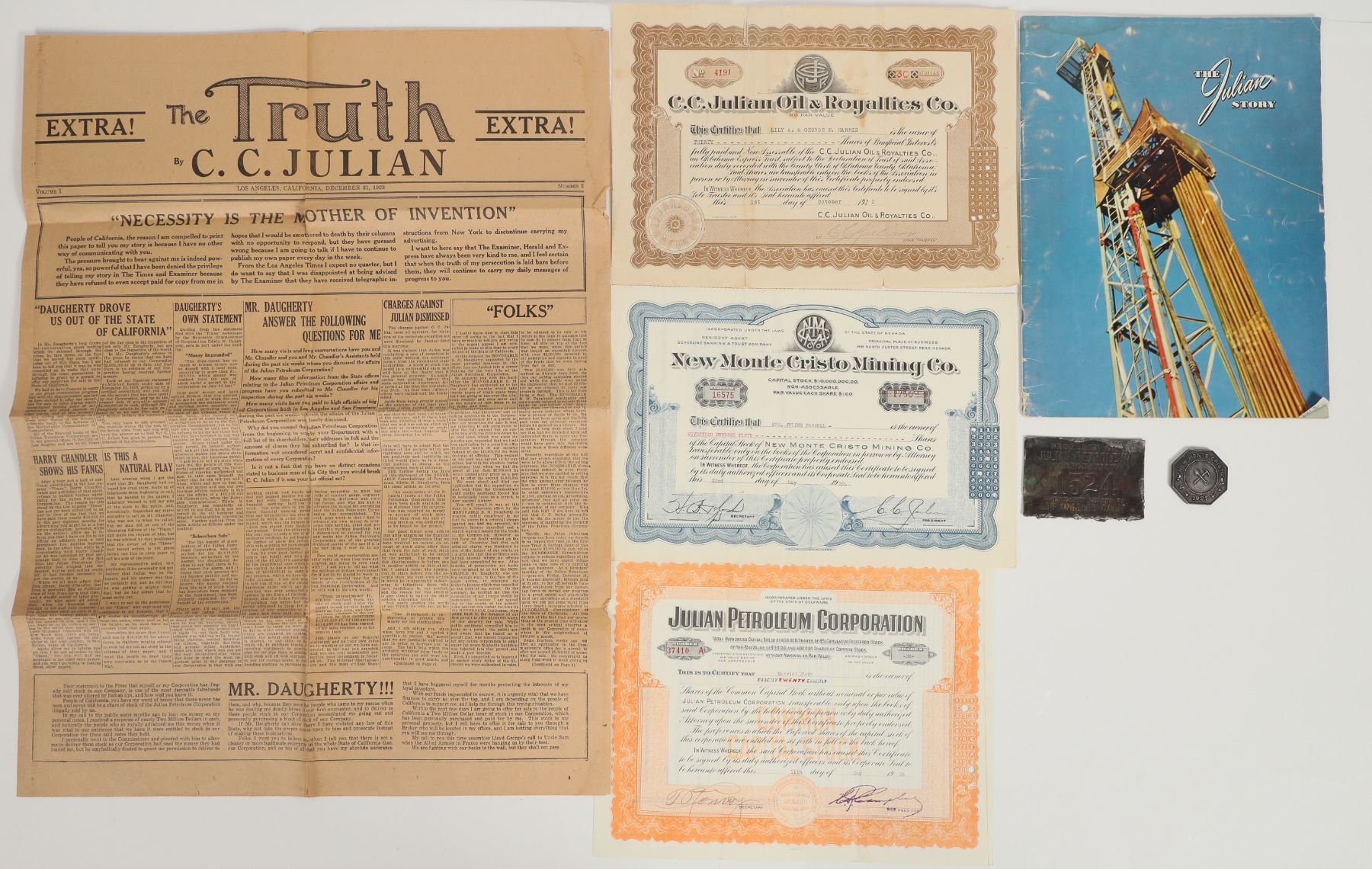 Chauncey C. Julian, The Great Swindler. This group covers the main swindles in which Julian was the promotor. 1) Julian Petroleum Corp., 1926 stock certificate, issued and uncancelled; and 2) a metal plate on this company removed from a 55-gallon drum, 2.5 x 3.5". 3) C. C. Julian Oil & Royalties Co., 1930 stock certificate, issued and uncancelled, some soiling, signed by Julian; 4) New Monte Cristo Mining Co., 1930 stock certificate, issued and uncancelled, signed by Julian. 5) The Julian Story, 40 pages, 9x12-inches, listing officers and describing the "crash" generated by Julian. 6) The Truth by C. C. Julian, 1923 newspaper insert touting his oil business, folds, toning. 7) C. C. Julian's Silver Medal. New Monte Cristo / (crossed pick and Shovel) / 1927 // (five stars) / (standing bear) / C. C. Julian. Silver, octagonal, high-relief, 42mm from flat to flat. Born in Canada, Julian worked odd jobs until he drifted into the "madness" of the Loa Angeles oil boom. He founded Julian Petroleum Corp. after securing an oil lease near Santa Fe Springs, California. Such was the "madness" that Julian sold $11,000,000 of stock in a few months. He also created the C. C. Julian Oil & Royalties Co. By 1926 he had secured as much money as he could on the lease, and he moved on to the California desert. He next promoted a lead mine northeast of Death Valley, and there he founded a town he called Leadfield. Julian hired a special 15-car Tonopah & Tidewater train to haul potential investors to the railroad station nearest Leadfield. The passengers were treated like royalty and given a feast to dive into. When the train left, it was filled with investors holding worthless stock certificates. On the move once more, Julian drifted to Constellation, Arizona, where in 1927 he acquired the Monte Cristo mine. He quickly began selling shares in the renamed New Monte Cristo mine, even issuing a silver medal to entice investors (see below). With the government trying to indict him for mail fraud, he jumped bail in Oklahoma and fled to China, where he committed suicide in Shanghai in 1934.