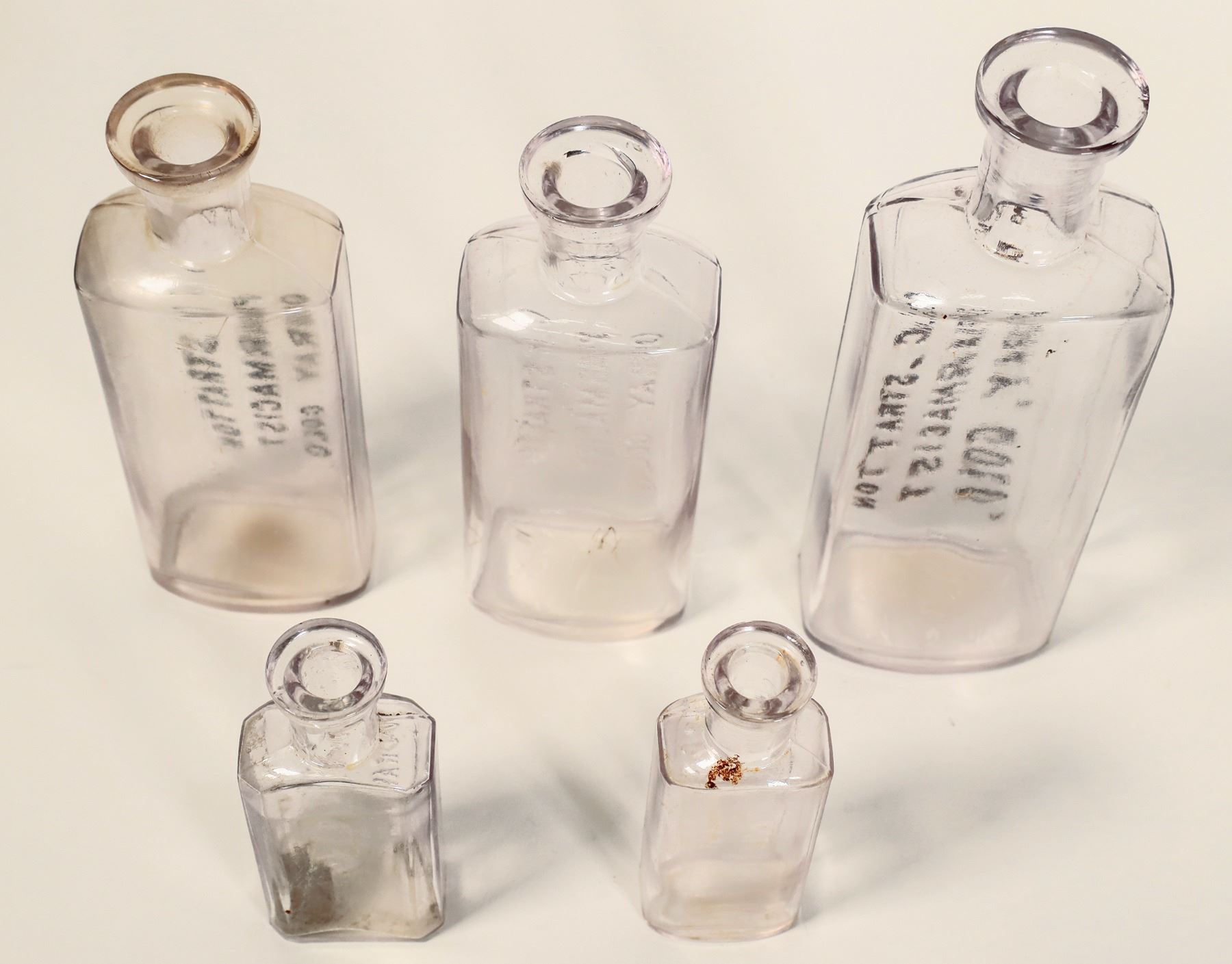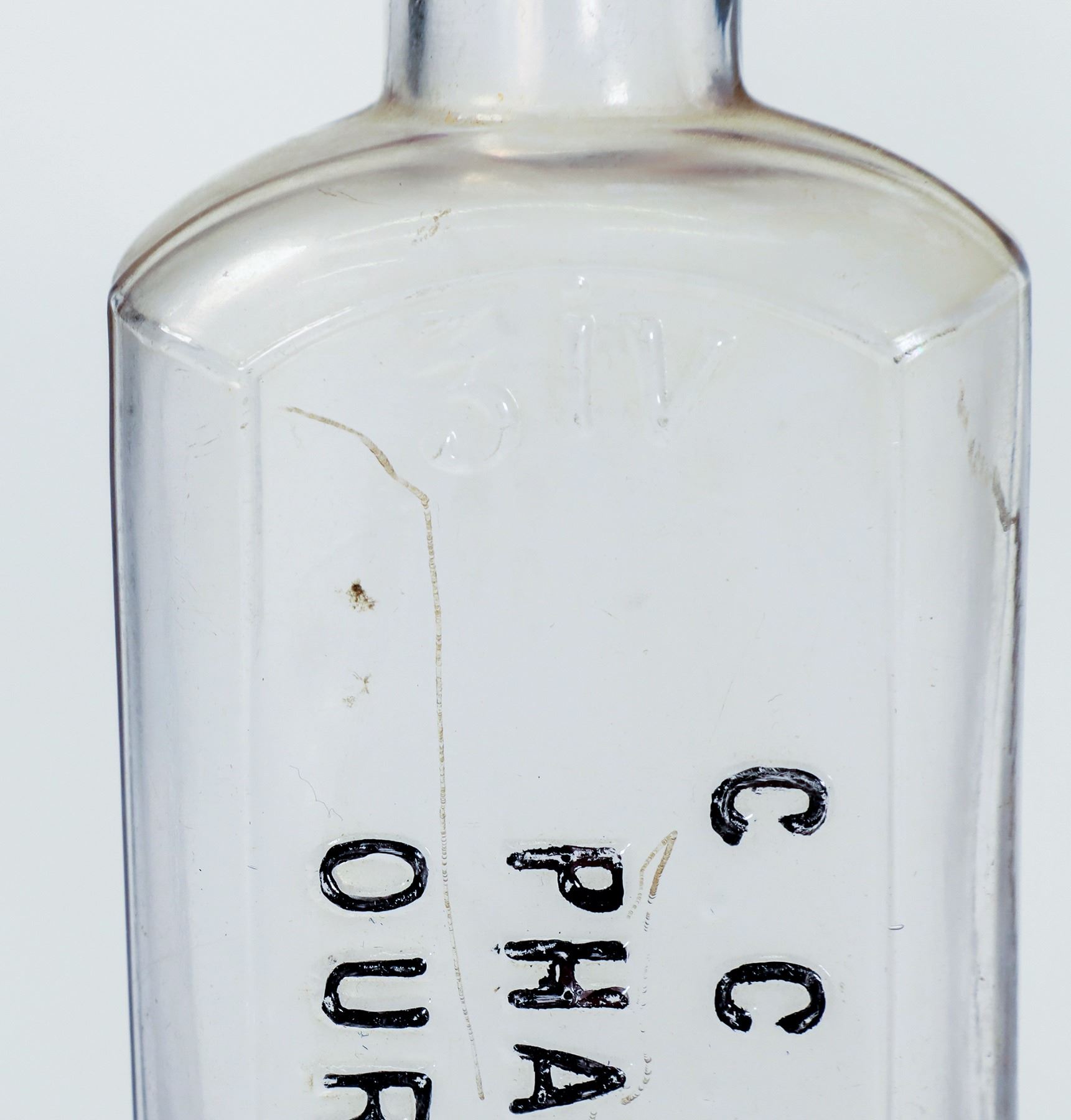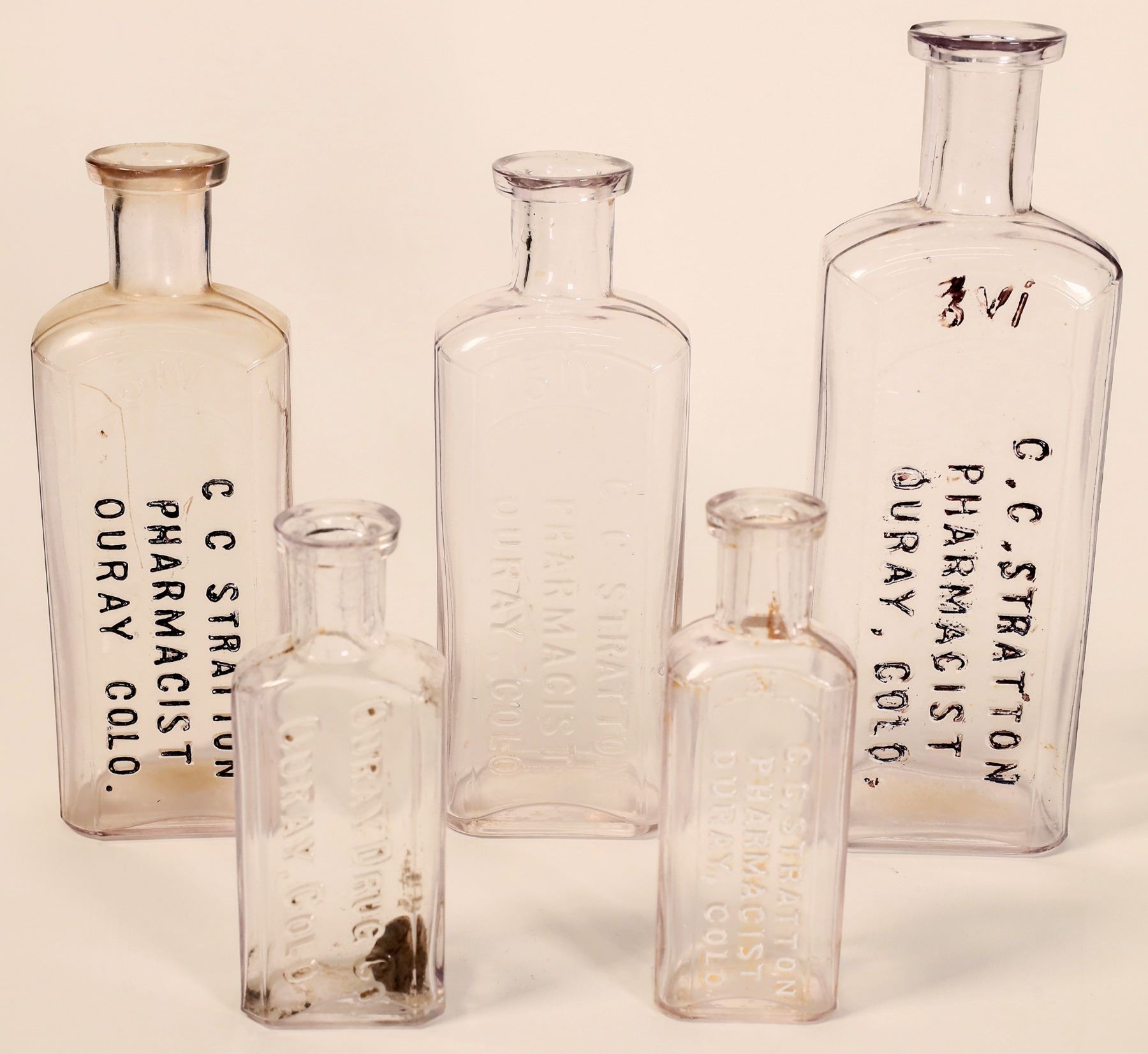Lot of 5. Four clear C C Stratton/Pharmacist/Ouray Colo. bottles. 2 have black lettering. About 5.5" tall, 1 has a light 2" crack. Plus Ouray Drug Co. bottle.