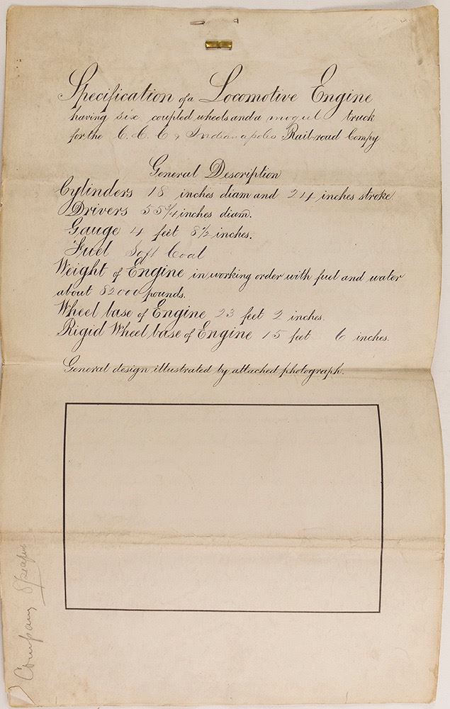4 pages of locomotive engine specification for a locomotive of the CCC & Indianapolis Railroad Co. Details include cylinder, bore, stroke, drivers, gauge, soft coal fuel, 23" wheelbase, shaft, contecting rods and more. Also tender specs. HWAC# 571576 Date: Location: Indiana
