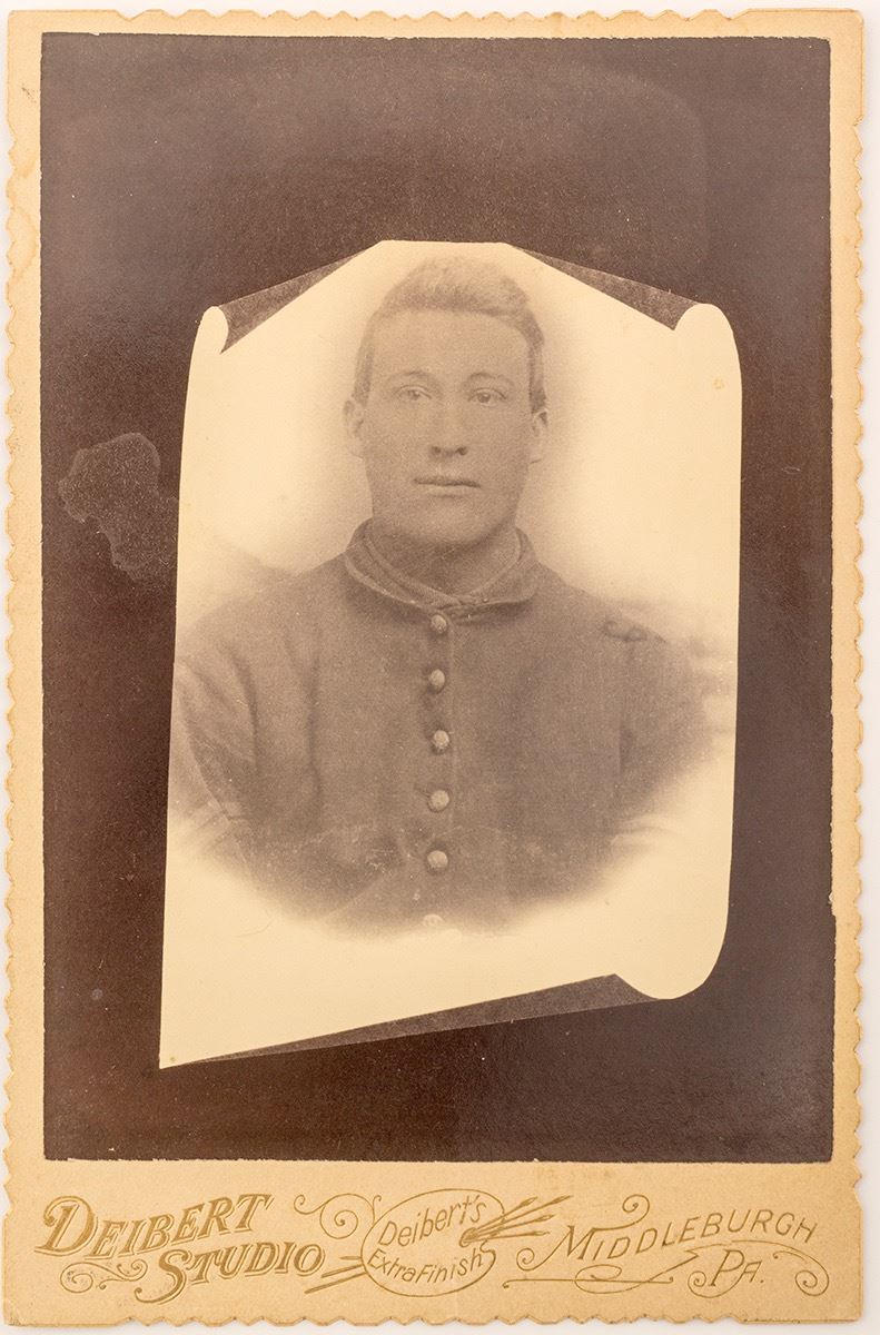 CDV of a Union soldier in a shell jacket. Possibly from Pennsylvania. Deibert Studios some water staining on reverse, light water impact on front. Date: Location: HWAC# 51619