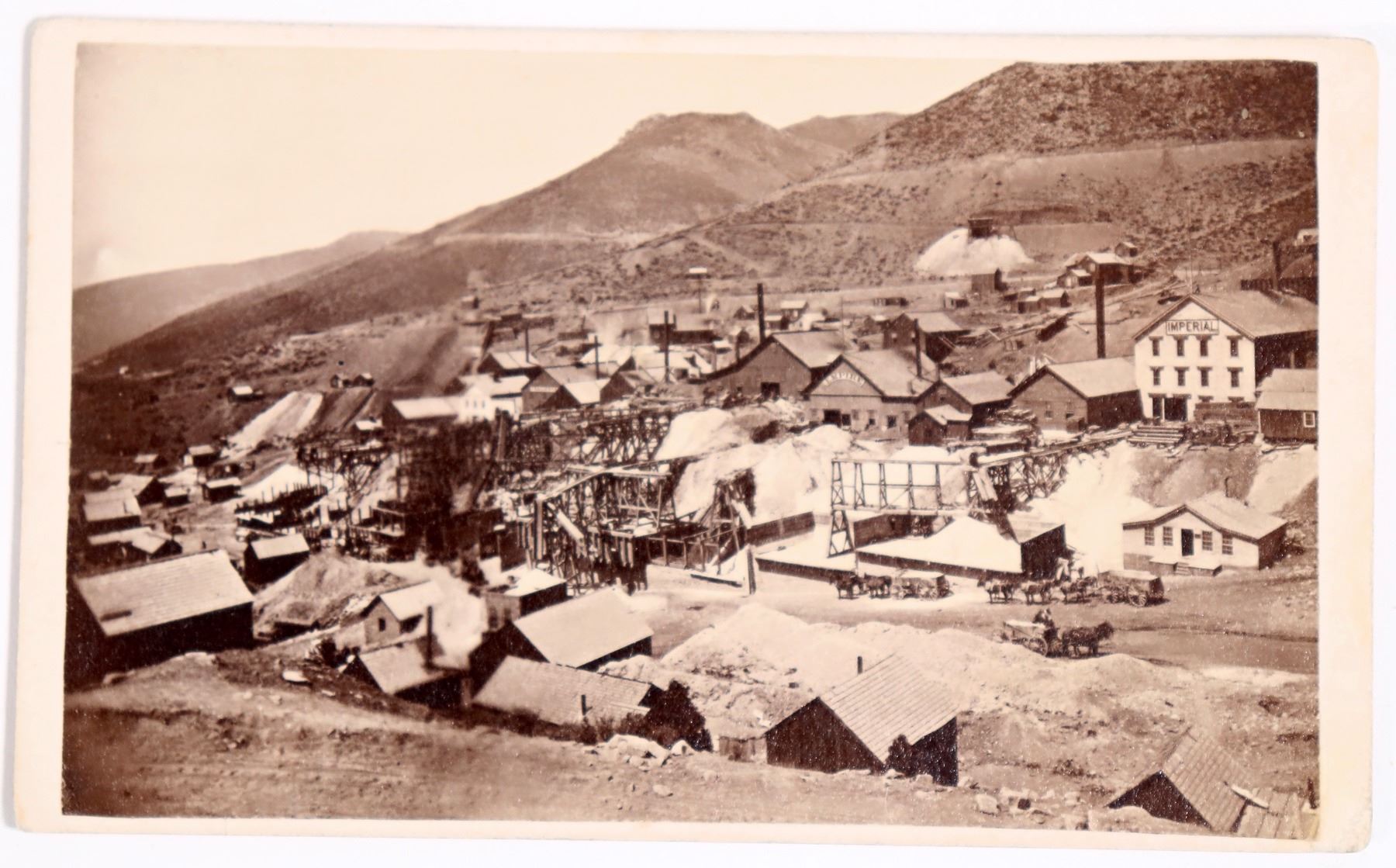 CDV of Quartz Mills at Gold Hill, Nevada, photo circa 1863-4, sold in 1865. Fantastic CDV by Lawrence & Houseworth. "738. Quartz Mills at Gold Hill." Two cent orange US IR Bank Check stamp attached, 1865. View is sharp with great contrast and detail! Shows a various business mining center of Gold Hill with numerous mine names visible. From left to right: Confidence, Challenge, Empire, and Imperial. In 1874, the Challenge and Confidence mines were consolidated. In 1876, the Empire and Imperial were consolidated with numerous other claims to form the Consolidated Imperial. Wagons can also be seen loading ore below the mines. Minor wear along edges. 2.25 x 4" A spectacular and rare snapshot of Gold Hill in the mid-1860s!