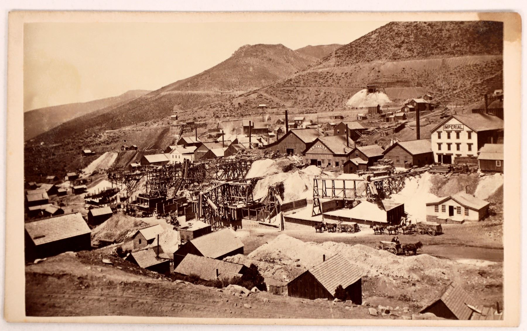 Fantastic CDV by Lawrence & Houseworth. "738. Quartz Mills at Gold Hill." Two cent orange US IR Bank Check stamp attached, but the date is a little illegible (likely 1865). View is sharp with great contrast and detail! Shows a various business mining center of Gold Hill with numerous mine names visible. From left to right: Confidence, Challenge, Empire, and Imperial. In 1874, the Challenge and Confidence mines were consolidated. In 1876, the Empire and Imperial were consolidated with numerous other claims to form the Consolidated Imperial. Wagons can also be seen loading ore below the mines. Stain in upper right corner. 2.25 x 4" A spectacular and rare snapshot of Gold Hill in the mid-1860s!