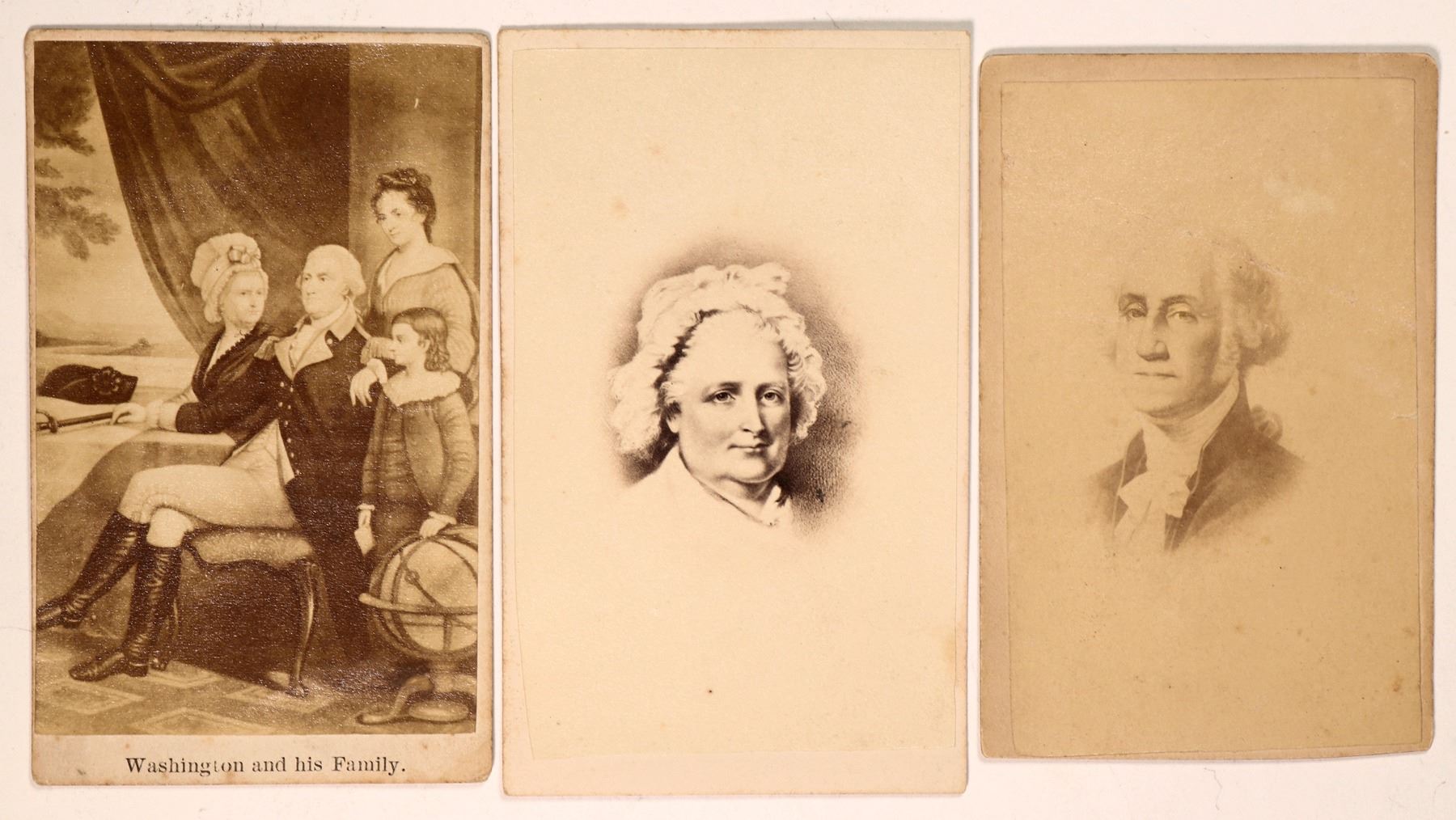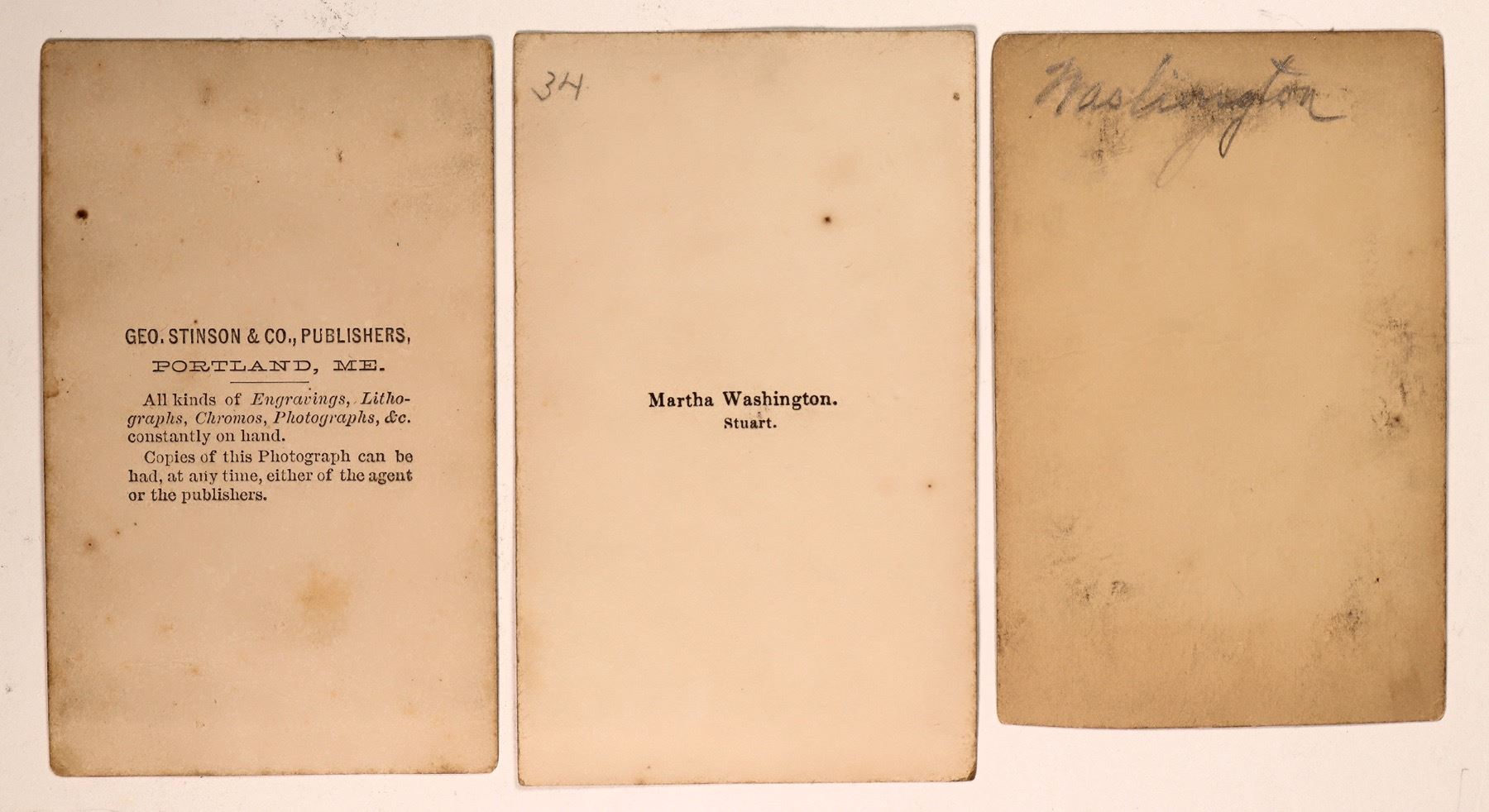 Three Carte de Visites of George Washington and his family, George Washington alone and his wife Martha Washington alone. One is printed, "Geo. Stinson & Co., Publishers..." on verso. George Stinson & Company was a lithography firm in Portland, Maine, operating from at least 1871 to 1890. All about 2.5" x 4".