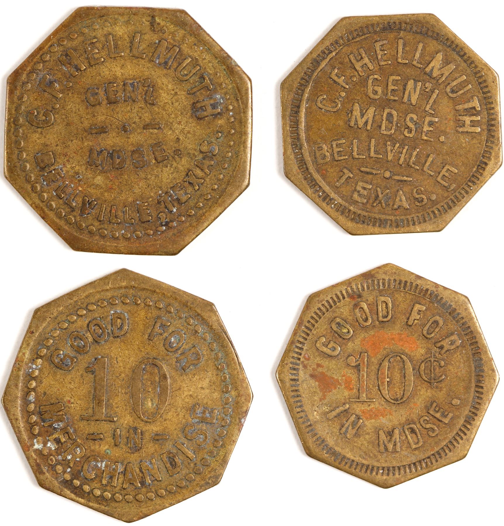 Octagonal brass 21mm and 24mm. C. F. HELLMUTH / GEN'L MDSE. / BELLVILLE, TEXAS. // GF /10C / IM State: Texas City: Bellville Date: HWAC# 62337