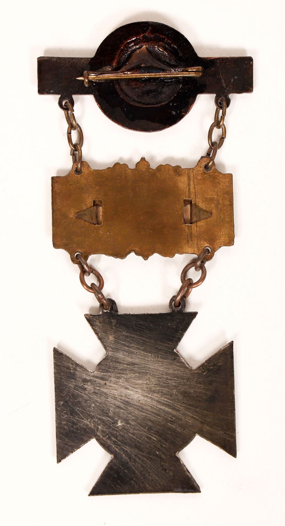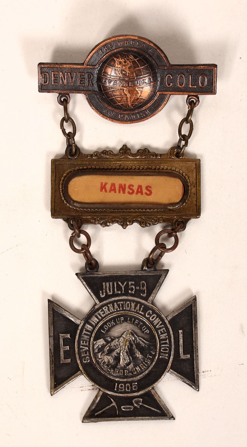 7th International Epworth League "All for Christ" Convention ; Hanging Medal Badge ; Kansas Delegate. Inscription: THE WORLD IS / MY PARISH / DENVER / COLO. / EVANGELIZE [over a globe] / KANSAS / JULY 5-9 /1905 / E / L / SEVENTH INTERNATIONAL CONVENTION / LOOK UP / LIFT UP / ALL FOR CHRIST. The hanging medal badge consists of a pewter medallion in the shape of a Maltese cross featuring a pictorial scene in the center. It hangs from a gold-gilted bar. Within this bar is a discolored plaque marked "KANSAS" in red. The uppermost section of the badge is a copper bar embossed with a globe in the center. [Colorado]