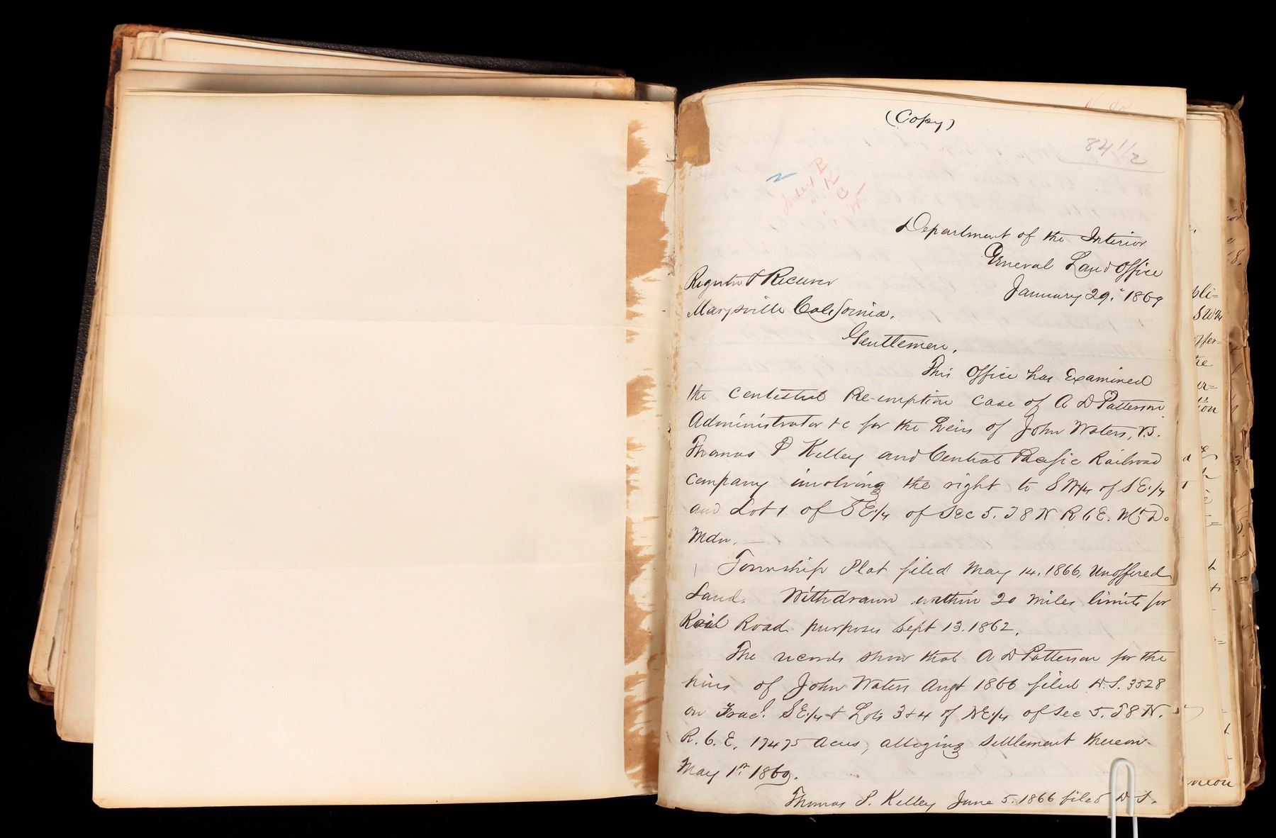 Exceptional letter copy book from Dept. of the Interior, General Land Office regarding claims of CPRR land, mineral title issues, conflicts, etc. for the Placer County region from the estate of W & P Nicholls, bankers, at Dutch Flat. Contains letters #1-134, as "copied from Johnson's Scrapbook." (letter 23 3/4). 8.5 x 10"2.5" thick, string bound but covers loose.