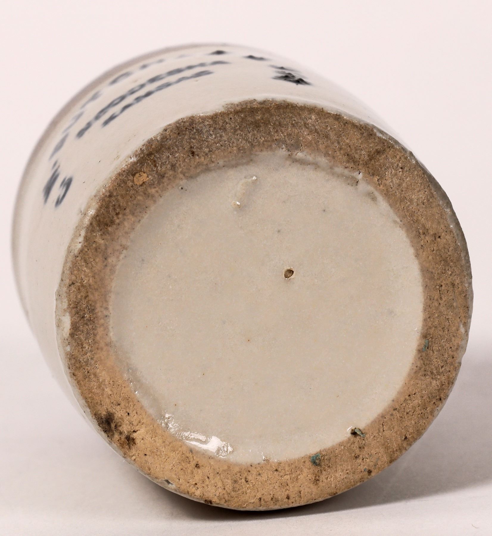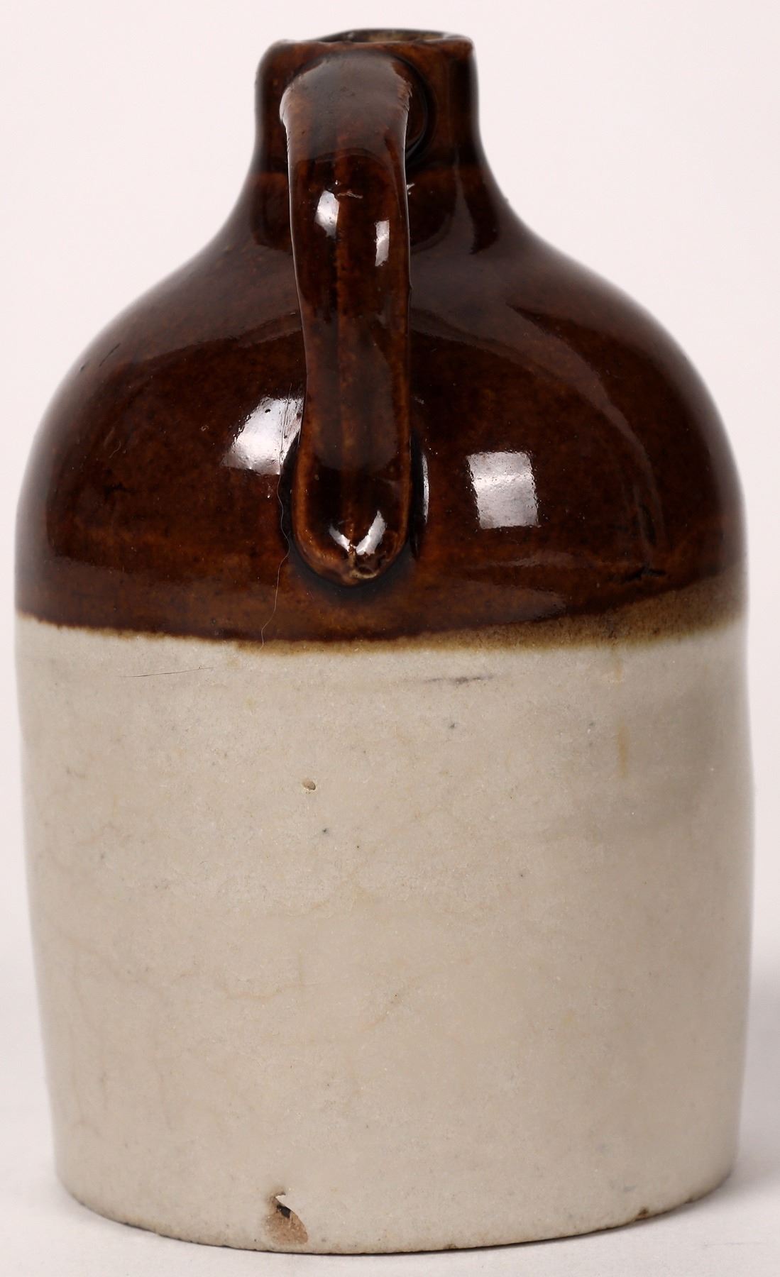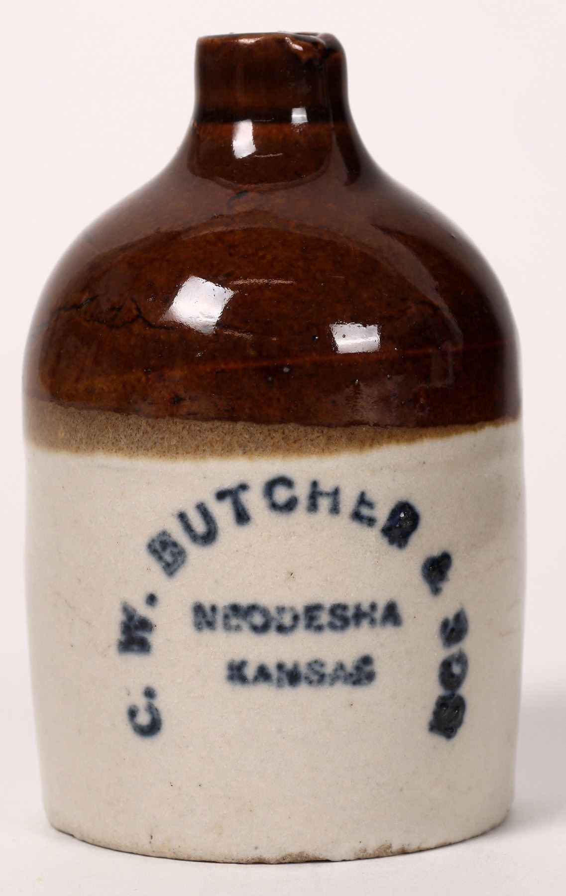 2 tone sloped shoulder mini jug with printed face. C W Butcher &Son./Neodesha Kansas. 2.75". Inner lip dings.