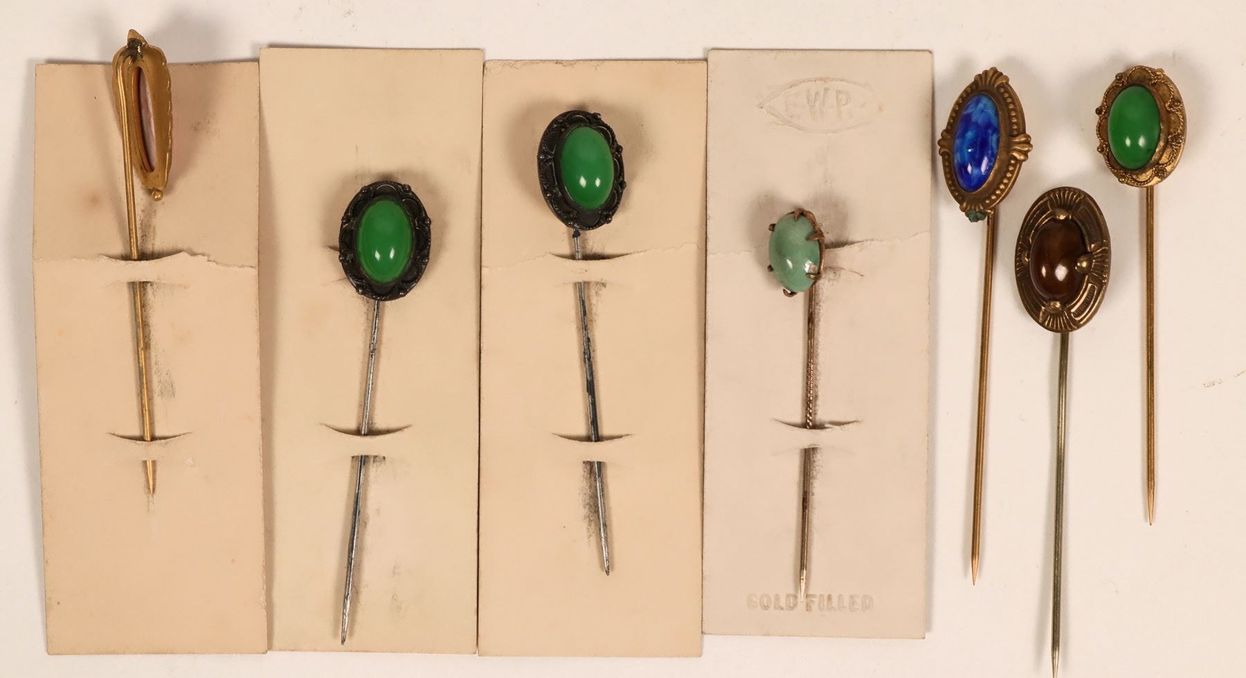 3) Single pin with vivid green "jade" stone in gold-tone setting