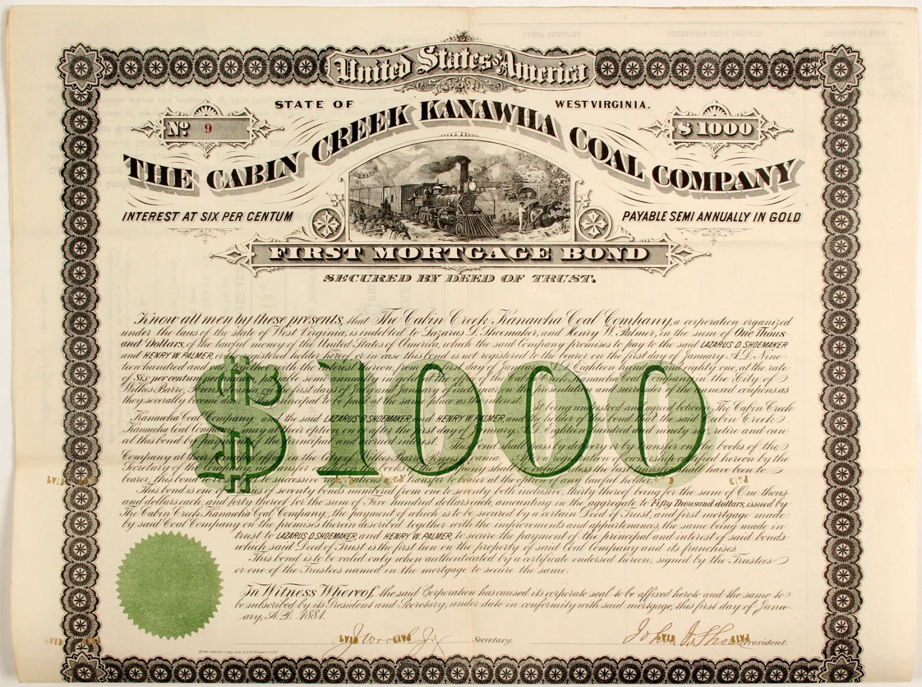 Very early # 8 with nice steam train vignette. 25 x 17". 36 of the 40 coupons attached. Coupons and bond cancelled with 'PAID' hole punch. Transferred three times within the Shonk family. Miner corner and edge issues. Very nice condition. Coal camps and coal camp houses can still be found in the Cabin Creek area. Famous for a 1912 strike. Ken Prag Collection