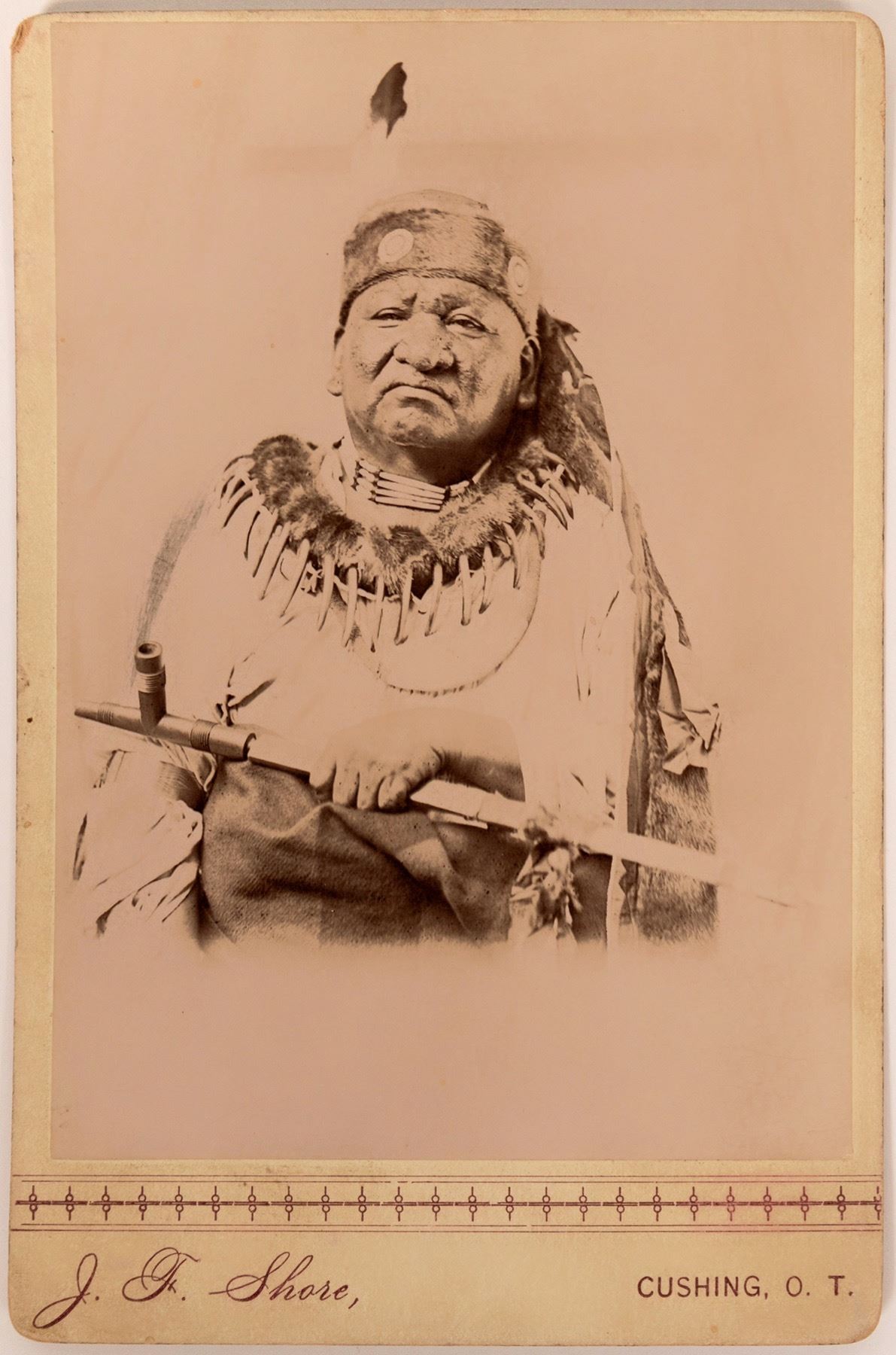 This cabinet card is of Chief Pa Ship Pa Ho of the Sac and Fox tribes while in Cushing, Oklahoma Territory 1900. He is shown wearing his bear claw necklace and otter wrap cap. The photographer J.F. Shore worked in Oklahoma about 1900. Contrast is good.