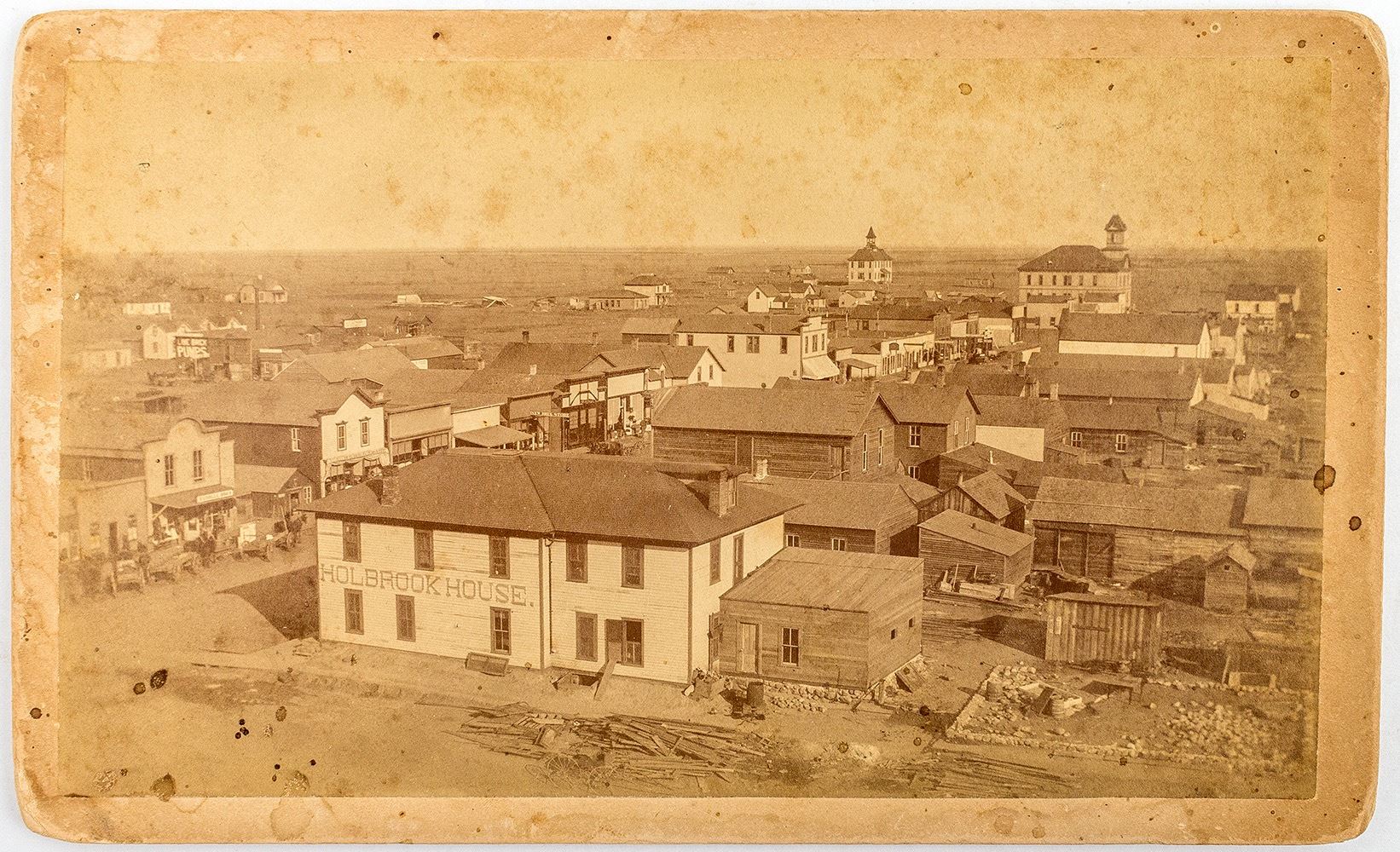 Cabinet card of Holbrook House Hotel in Holbrook, Arizona. The hotel burned down and was later rebuilt with brick. Note the freight wagons in front of hotel, photo circa late 1880s. Holbrook was known as "the town too tough for women and churches" and in 1914 was said to be the only county seat in the U.S. that didn't have a church State:Arizona City:Holbrook Date: ID# 48950
