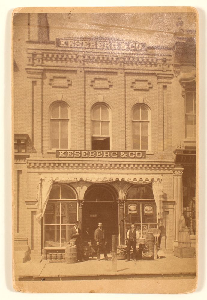 Cabinet card 4.25" x 6.5" that shows two-story brick building with sign "Keseberg & Co." Four gentlemen standing in front of the business. One of these (far left?) is most likely Louis Keseberg, the owner, and a notorious figure in California history. Keseberg was the last person to be rescued of the Donner Party in April 1847. He was also accused of both murdering and eating Tamsen Donner, who had stayed behind with her dying husband when others set out from the camp. Keseberg denied the murder, but confessed to cannibalizing her body.