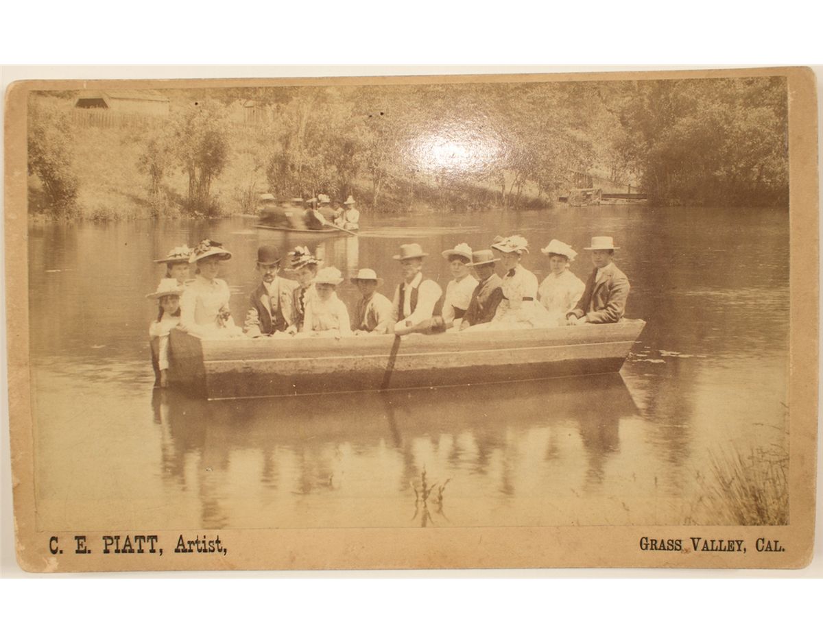 View shows 13 people, men , women, and children, enjoying a ride on the river in a canoe. In the distance is another boat, though out-of-focus. Measures 8.5" x 5.25" C.E. Piatt, Artist, Grass Valley. According to Mautz, Piatt was active in Grass Valley c.1880. Reverse has stamp signature of Gertrude P. Brown with the date June 8, 1889 written in pen beneath. Perhaps Gertrude is one of the women pictured? Contrast is low, bleaching present, and the whole card is warped. Still a unique 19th century view!