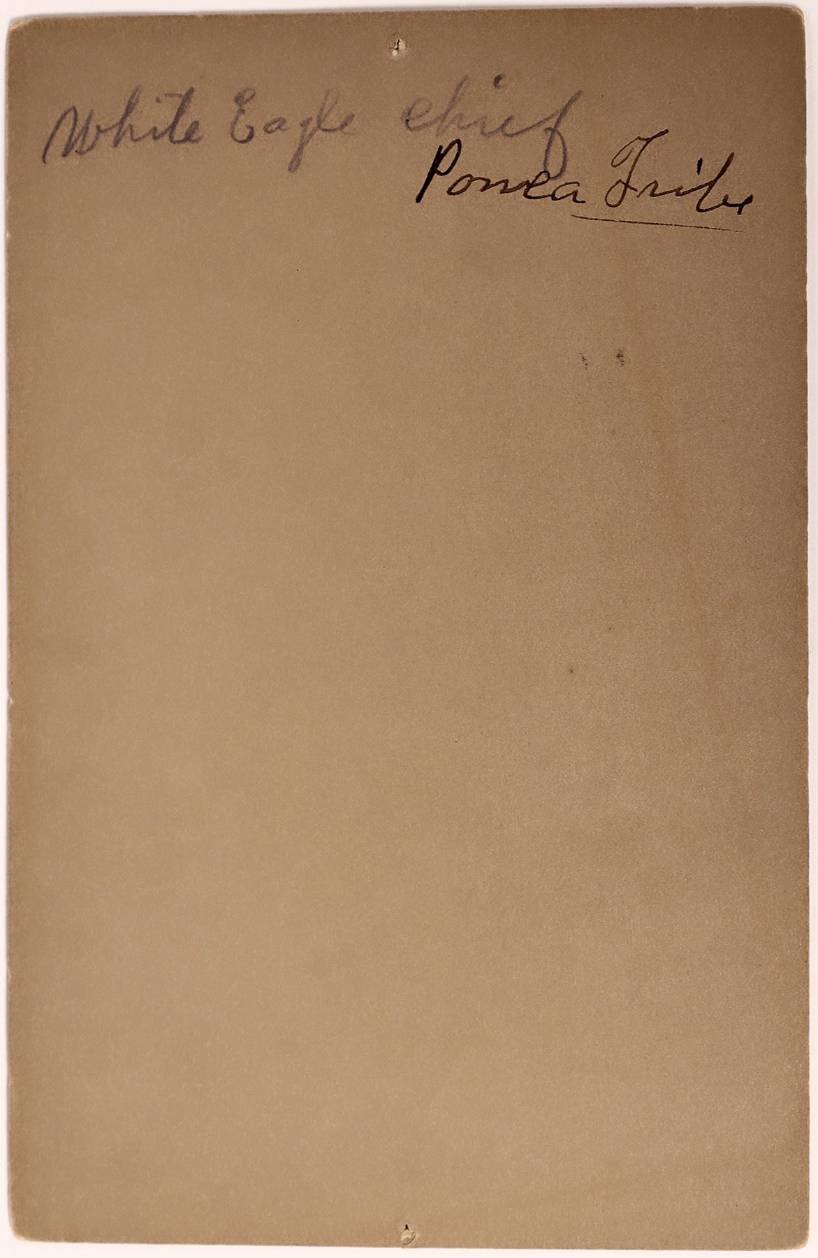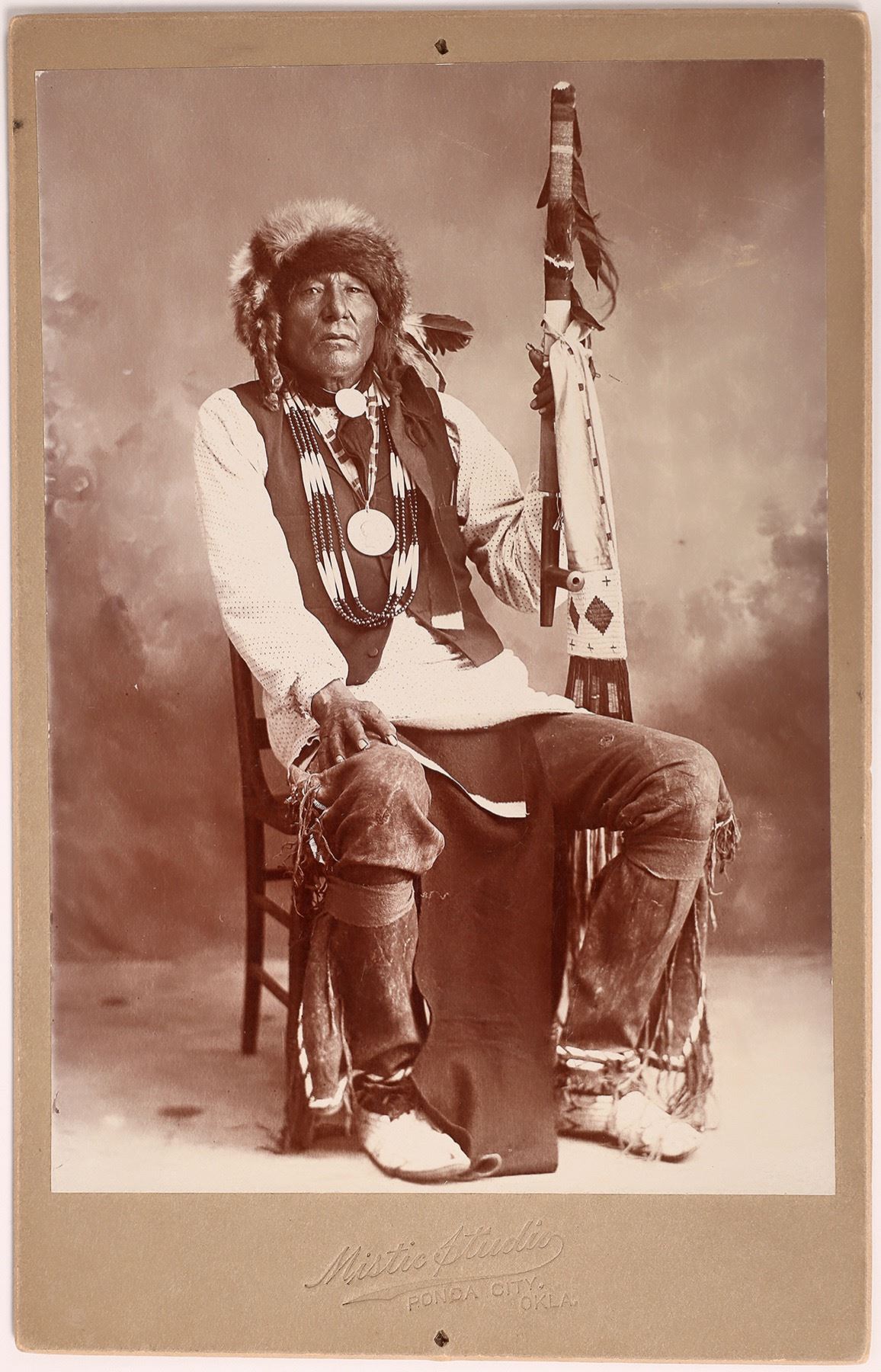 This cabinet card is of White Eagle Ponca Chief. Clearly studio staged; he sits with a peace medal, peace pipe, a beaded scabbard, single feather headdress, and beaded moccasins with high wrap leggings. From the Mistic Studio in Ponca City, Oklahoma. Post 1907 photo. 4in. X 6.5 in. pin holes top/bottom center on the card backing. Actual photo is intact.
