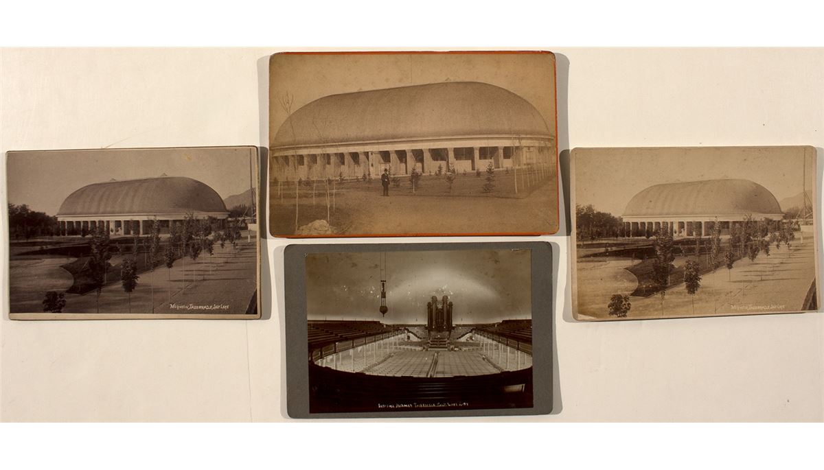 Four cabinet cards, three different views. 1) Duplicate view of the exterior to the Mormon Tabernacle, photographed by C.R. Savage. One card has Savage's information on reverse: C.R. Savage/ Art Bazar/ Salt Lake CIty. The other does not, but has better contrast. 2) DIfferent view of exterior, with man in top hat standing in front. Photographer is C.W. Carter. Medium contrast, but soiling. 3) Interior view of the tabernacle. No photographer identified, but possibly Savage. Good contrast, but scratches and soiling. (Prag Collection)