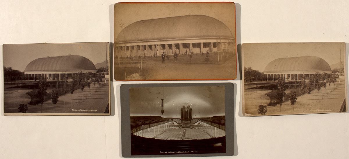 Four cabinet cards, three different views. 1) Duplicate view of the exterior to the Mormon Tabernacle, photographed by C.R. Savage. One card has Savage's information on reverse: C.R. Savage/ Art Bazar/ Salt Lake CIty. The other does not, but has better contrast. 2) DIfferent view of exterior, with man in top hat standing in front. Photographer is C.W. Carter. Medium contrast, but soiling. 3) Interior view of the tabernacle. No photographer identified, but possibly Savage. Good contrast, but scratches and soiling. (Prag Collection) City: Salt Lake City State: Utah Date: hwac# 27141
