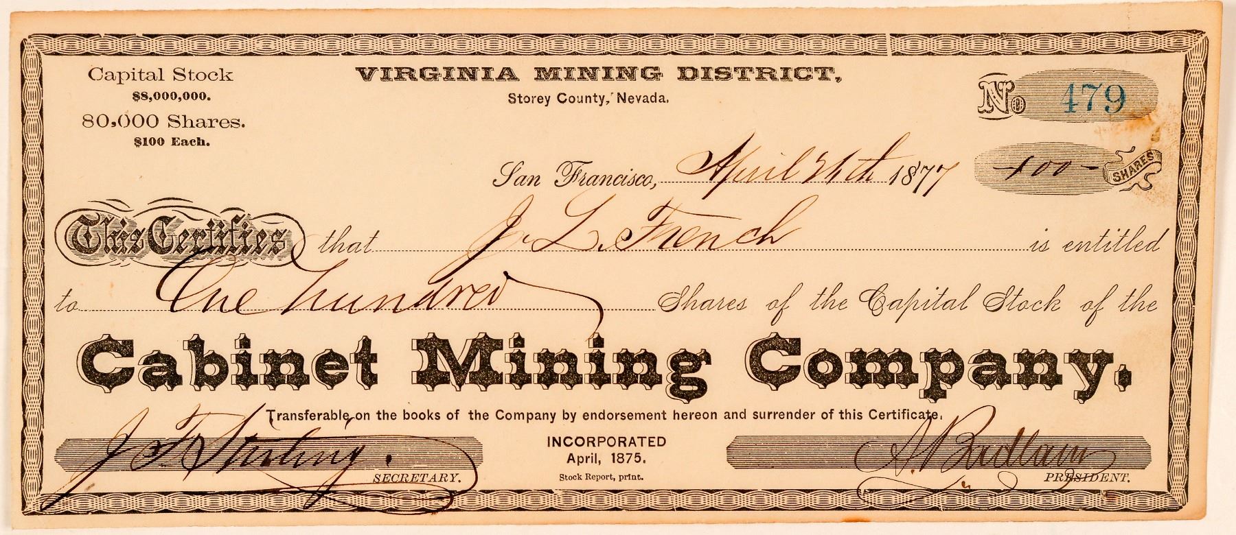 Virginia Mining District, Storey County, Nevada (printed at top center). Inc. April 1875. No. 479, issued for 100 shares to J.L. Trench on April 24th, 1877 in San Francisco. Signed by president A. Badlam and secretary J.F. Stirling. Not cancelled. Simple design with black border and print. Stock Report Print. 4 x 9.25" Pinholes, stain at upper right. Balch, 1882, says that this mine is in the Gold Hill District. No developments noted (pg. 1179-1180). () Ken Prag Collection