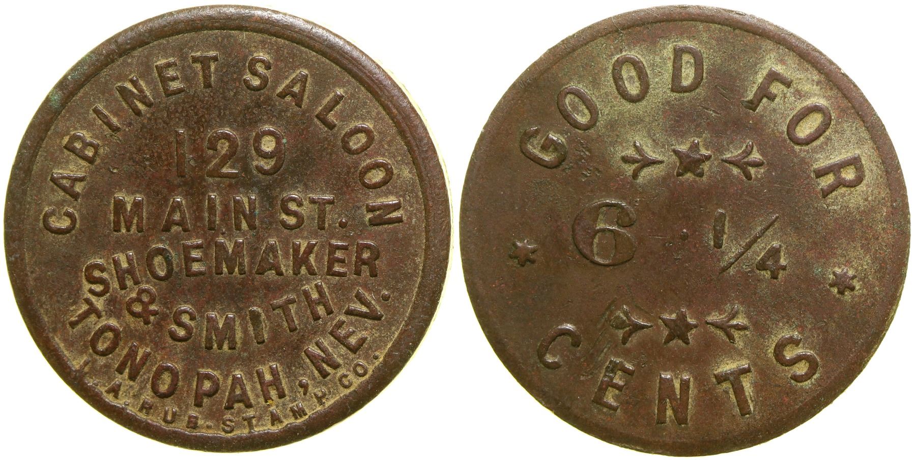 Obv.: Cabinet Saloon / 129 / Main St. / Shoemaker / & Smith / Tonopah, Nev.: Rev.: Good For / 6 1/4 / Cents. Copper, rd., 21 mm.