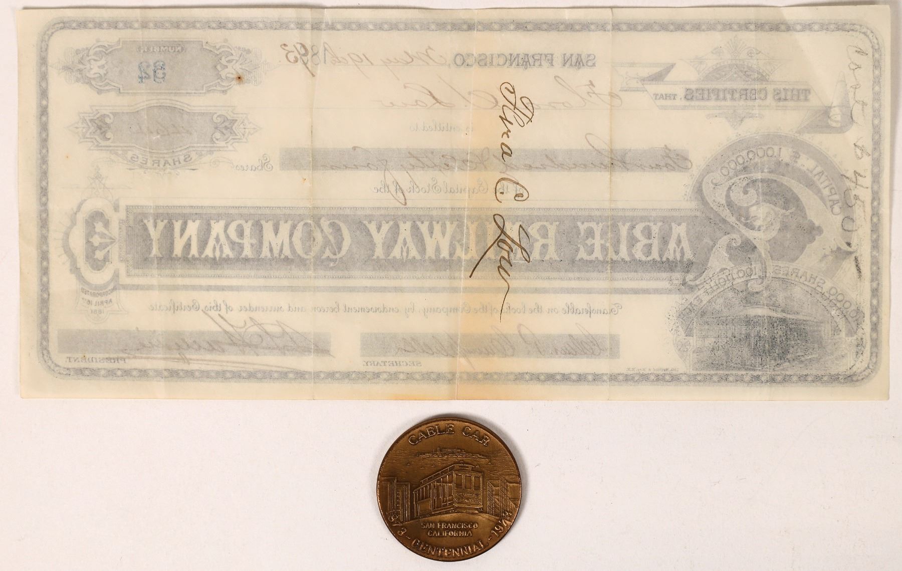 This certificate is from a later cable car company dated 1893. Cert. #32. Printed by Britton & Rey, S.F. Joseph Britton and J.J. Rey were also directors of his original Clay Street Cable Company. Uncanceled. Included with this great signature piece is a Cable Car Centennial Token with Hallidie pictured on the front with a cable car on the back. Inscribed, "Andrew Hallidie- Father of the Cable Car".