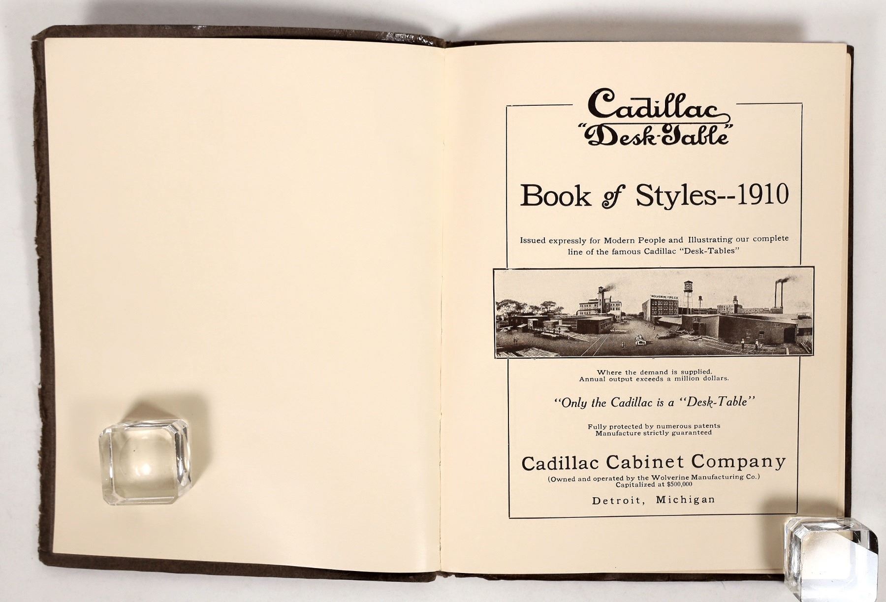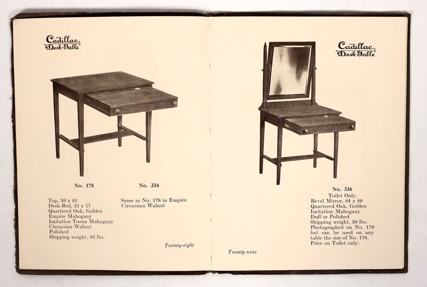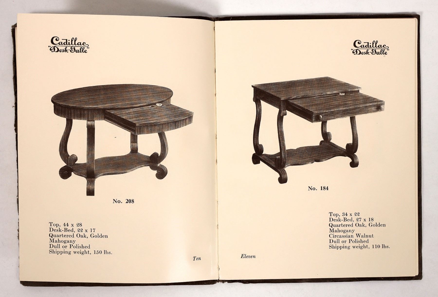 1910 The Famous Cadillac Desk Tables catalog. Owned by Wolverine Manufacturing offering oak and other wood cabinets, desks etc. Illustrations and photos. Nice piece.