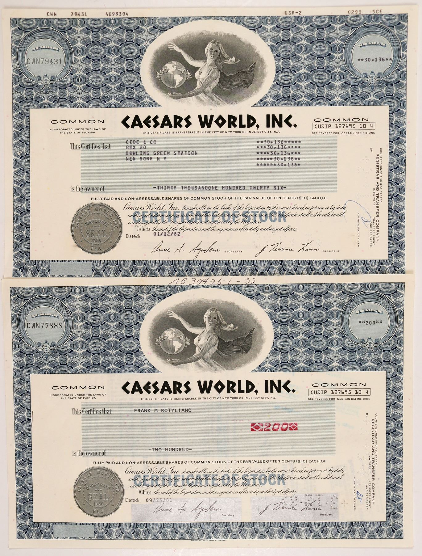 Lot of two stocks issued in 1981 and 1982. Both punch cancelled. Blue border, vignette of allegorical caped woman next to a globe. ABN. 8 x 12" Pinholes, folds, one with staples. Originally a restaurant chain (Lum's Inc.) who bought Caesar's Palace in Las Vegas and shifted to gaming. Eventually purchased by Park Place Entertainment in 1999. Ken Prag Collection