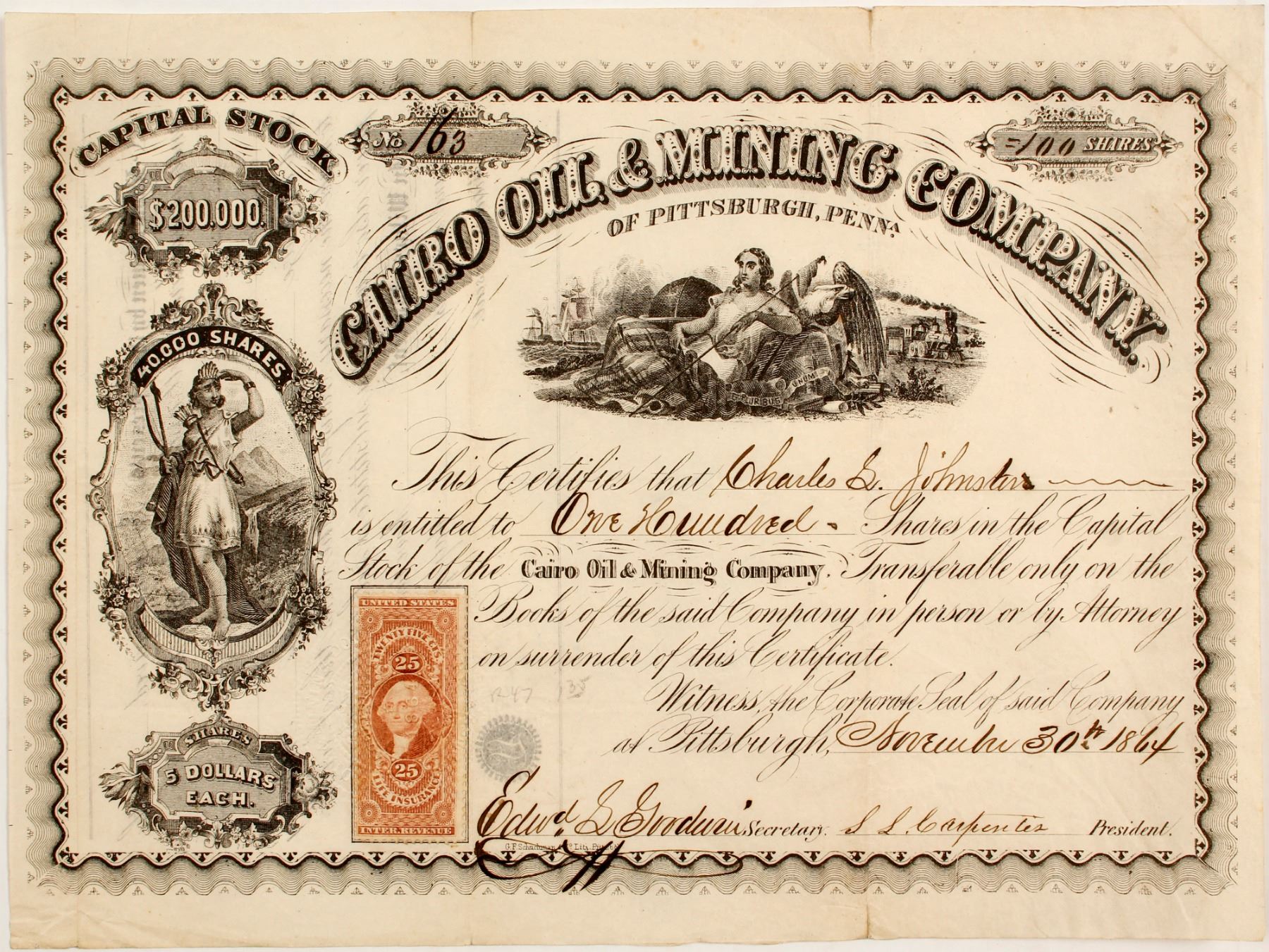 # 163 for 100 shares to Charles S Johnston. Signed by Edward S Goodwin and SS Carpenter. Dateline Pittsburg 1864. Allegorical vignettes. BF Schuchman printer. 25c Life Insurance Revenue Stamp. Small rips at fold edges, dog ear, two small holes where ink has eaten through the paper. Look nice! Cairo is north of Allentown and northeast of Harrisburg. Ken Prag Collection