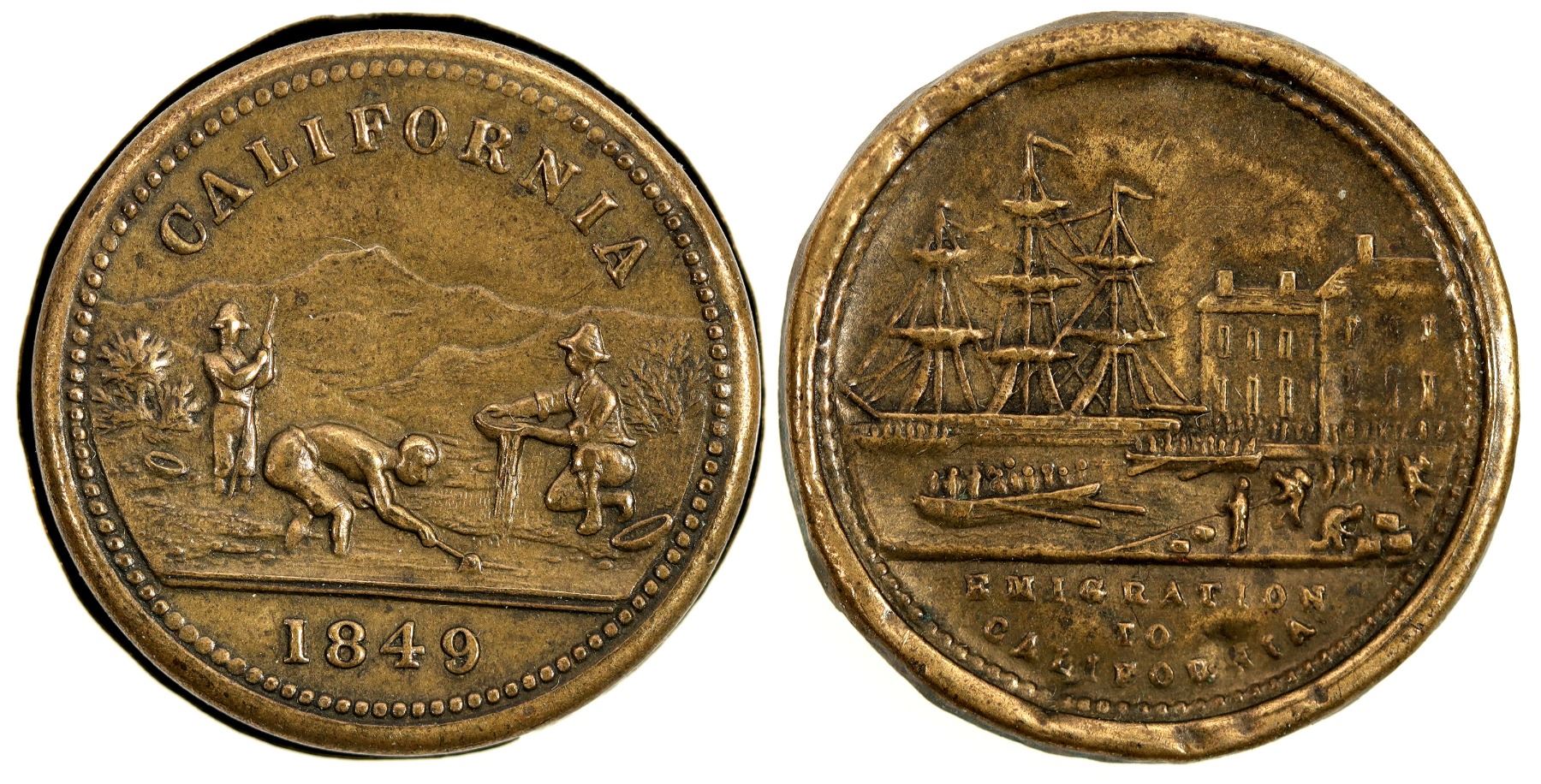 Obv.: California / (miners) / 1849; rev.: (harbor scene) Emigration / To / California. Br., rd., 23 mm.