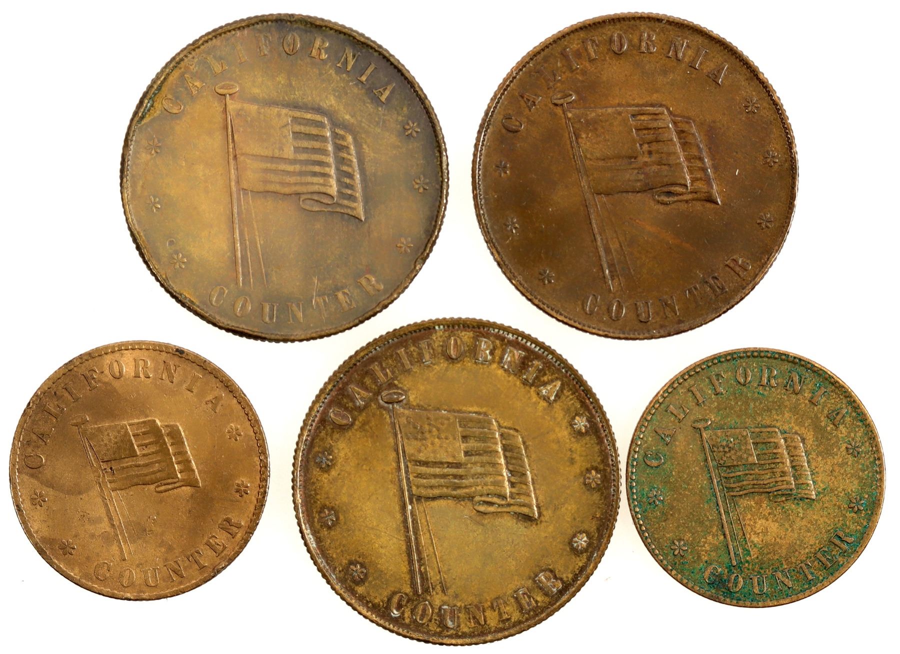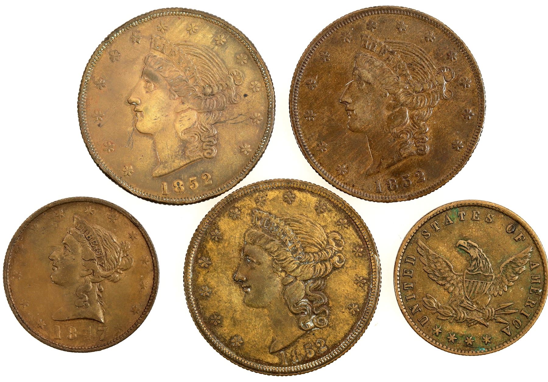 Lot of five: three twenty dollar size (34 mm); two ten dollar size (28 mm). Obv.: California / (flag) / Counter; rev. Liberty Head / 1852. One ten dollar size is dated 1847, the other has an eagle on reverse instead of Liberty.