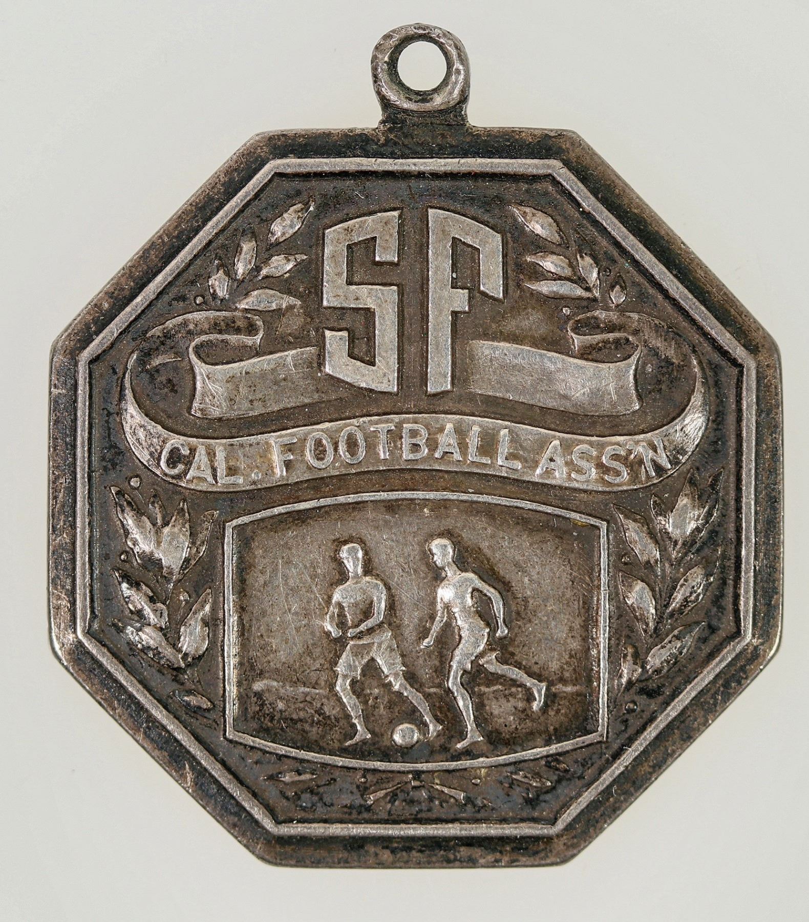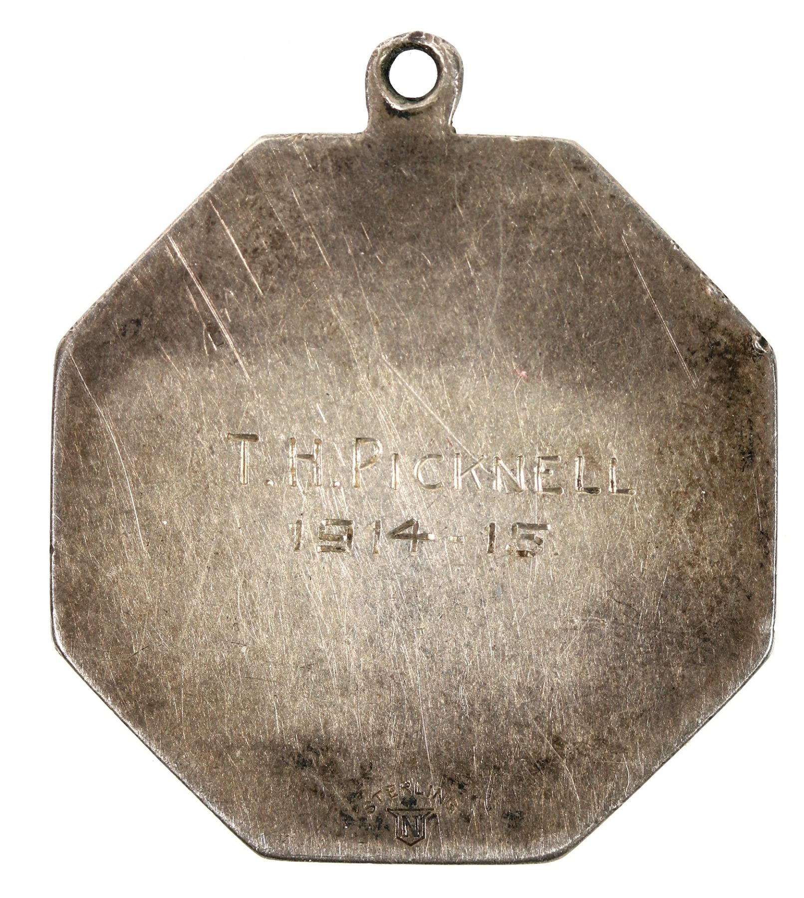 Engraved sports medal to T. H. Picknell 1914-15 from the Cal. Football Ass'n. 19.5 grams; 34 mm.