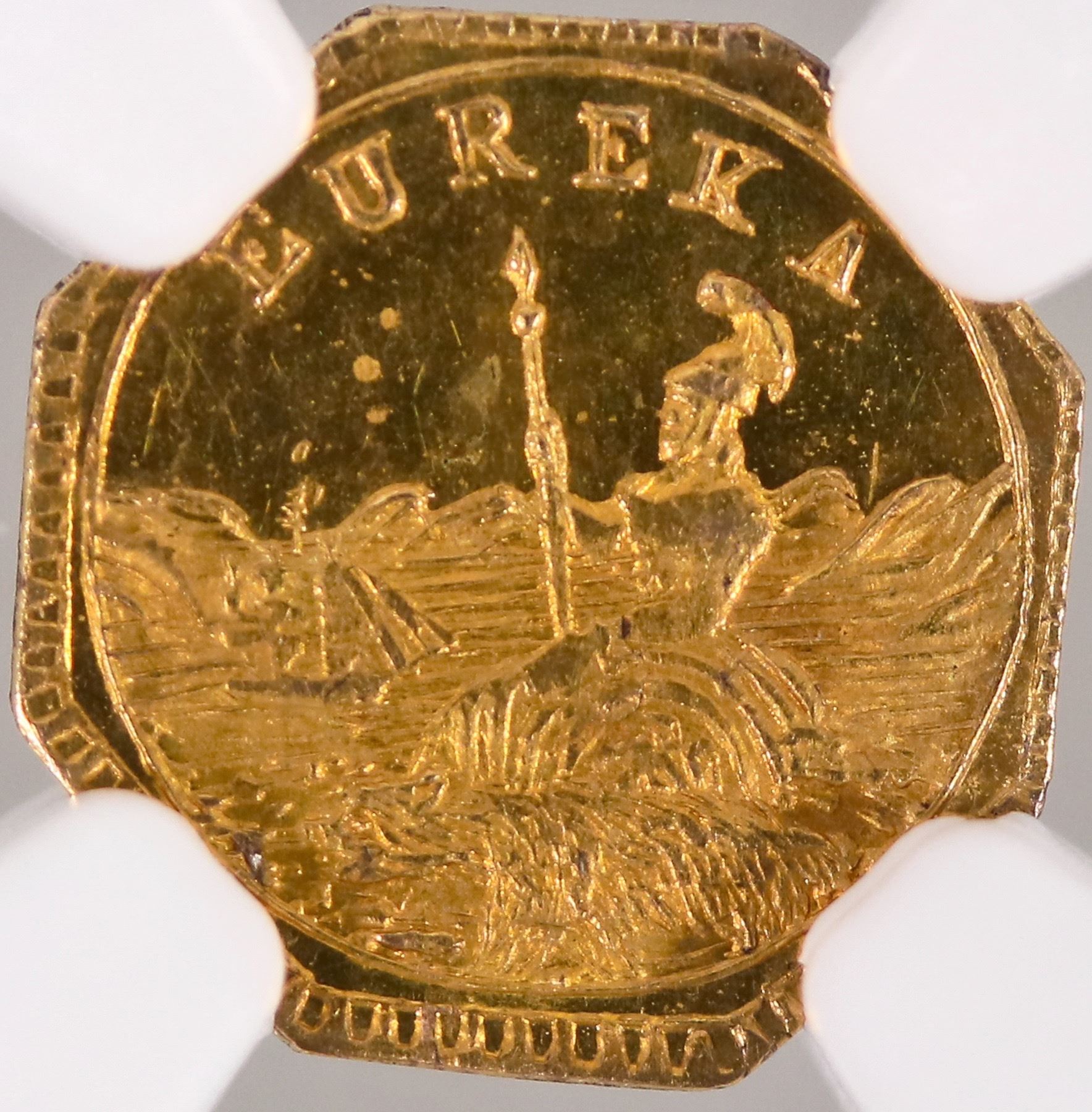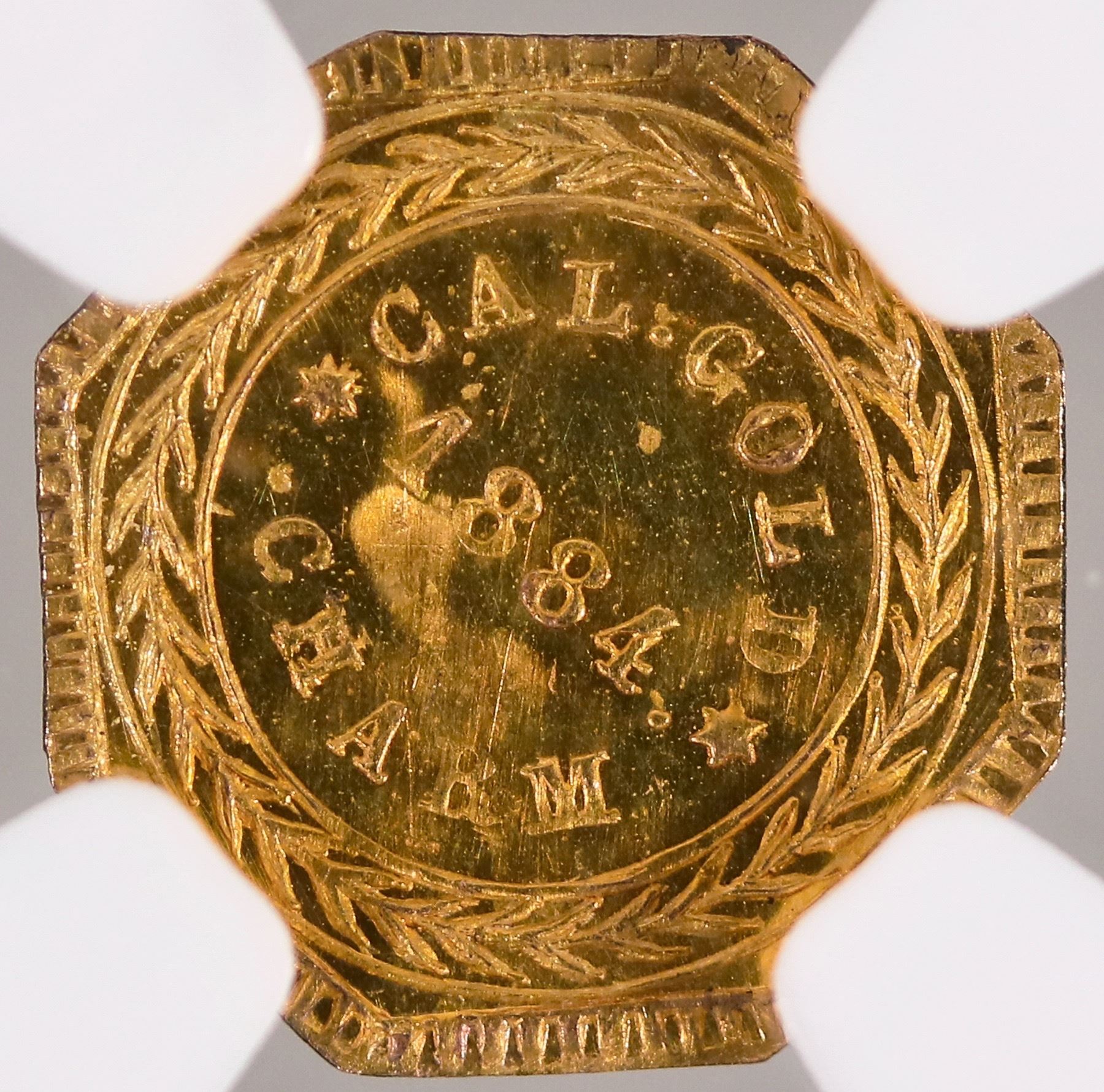 NGC certified MS 65 PL. 1884 dated California Gold charm. Arms of California; Wreath #2. Octagonal, 11 mm.