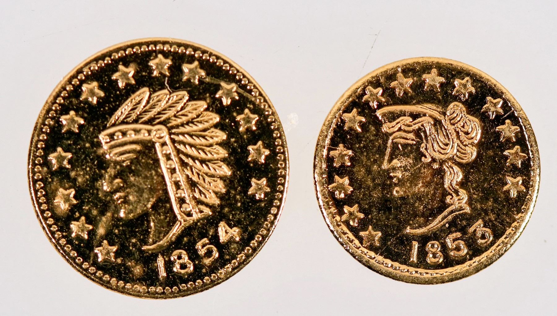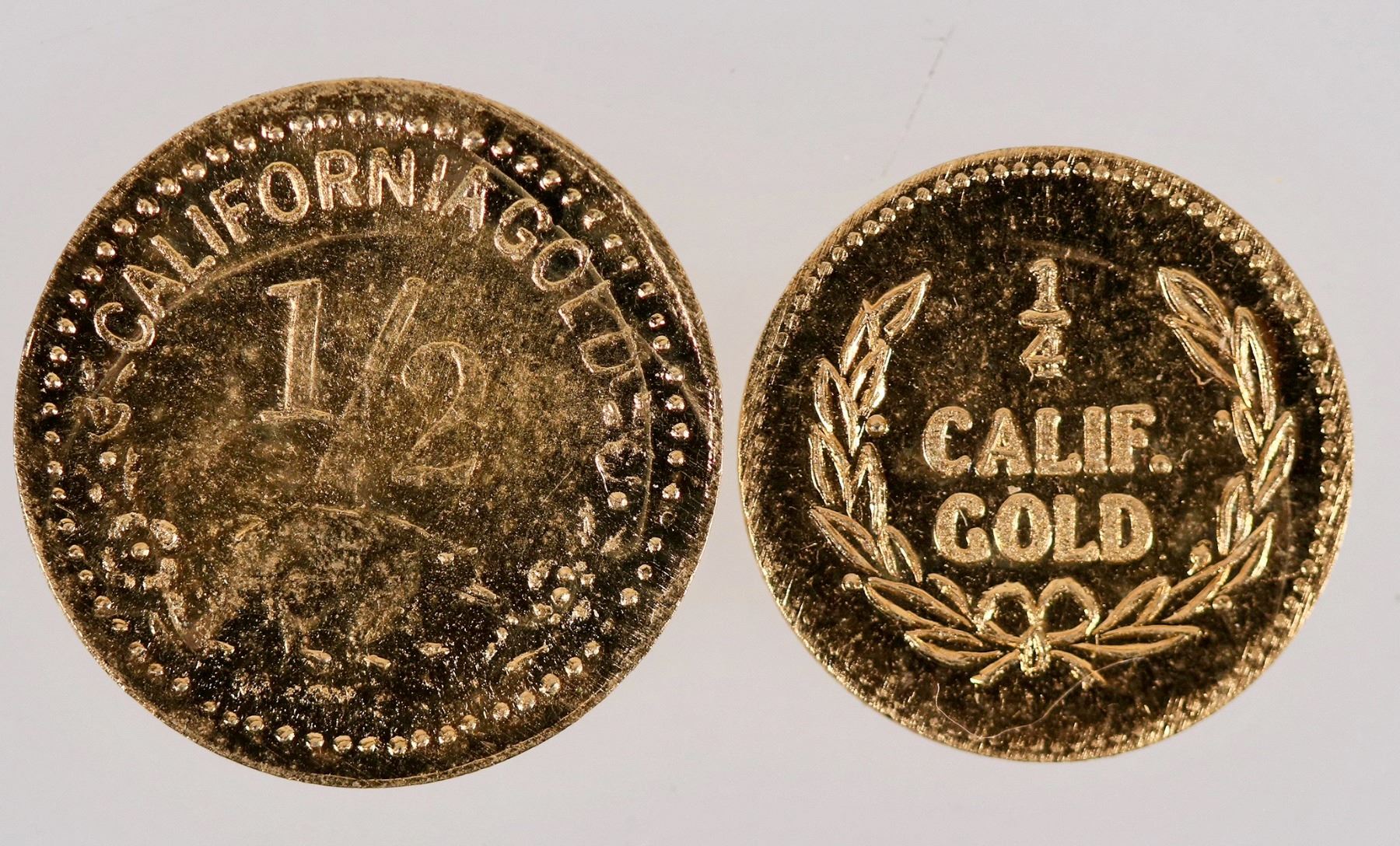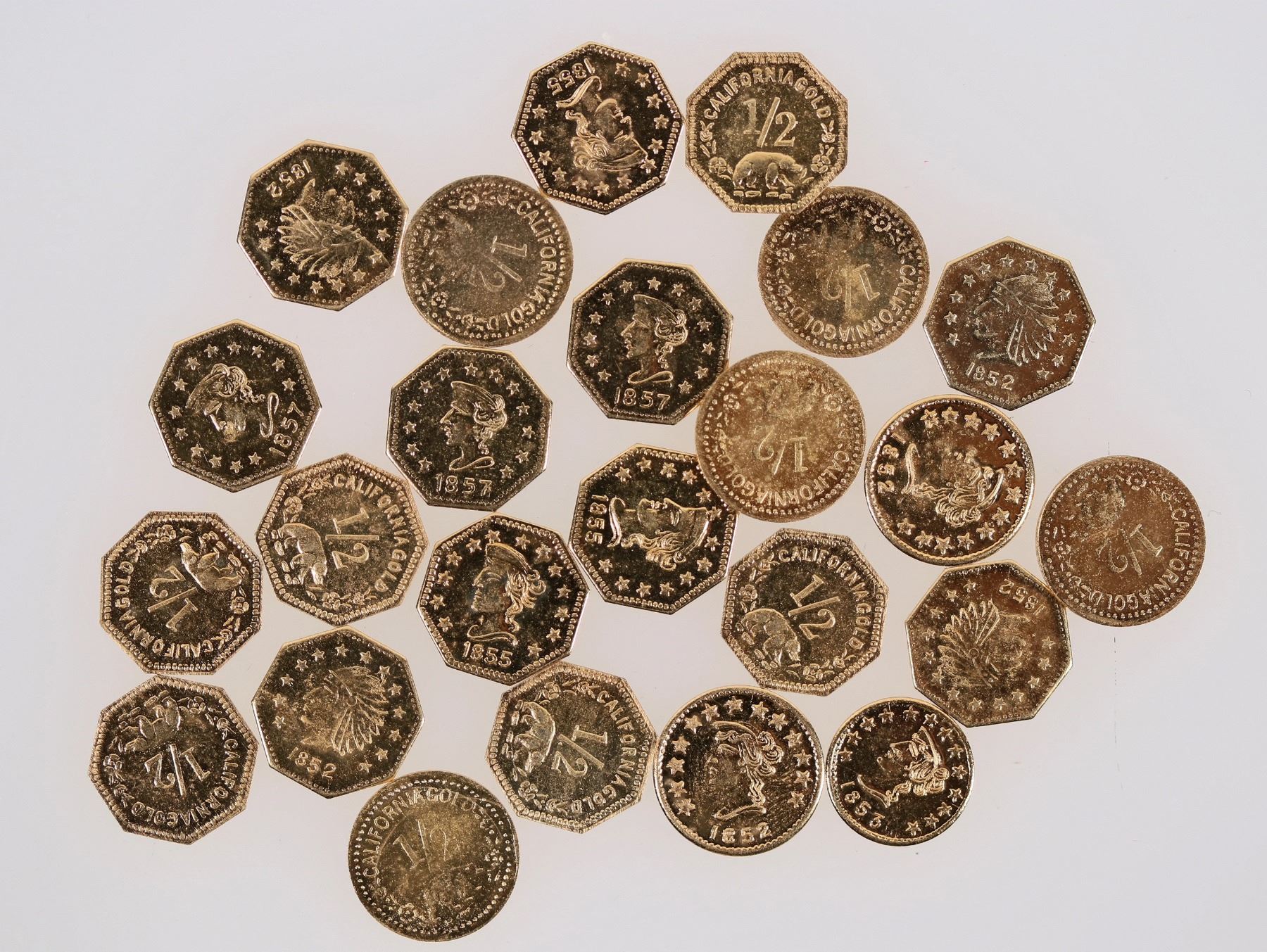 Two dozen brilliant uncirculated octagonal and round Cal gold tokens. 12 mm round; 11 mm octagonal.