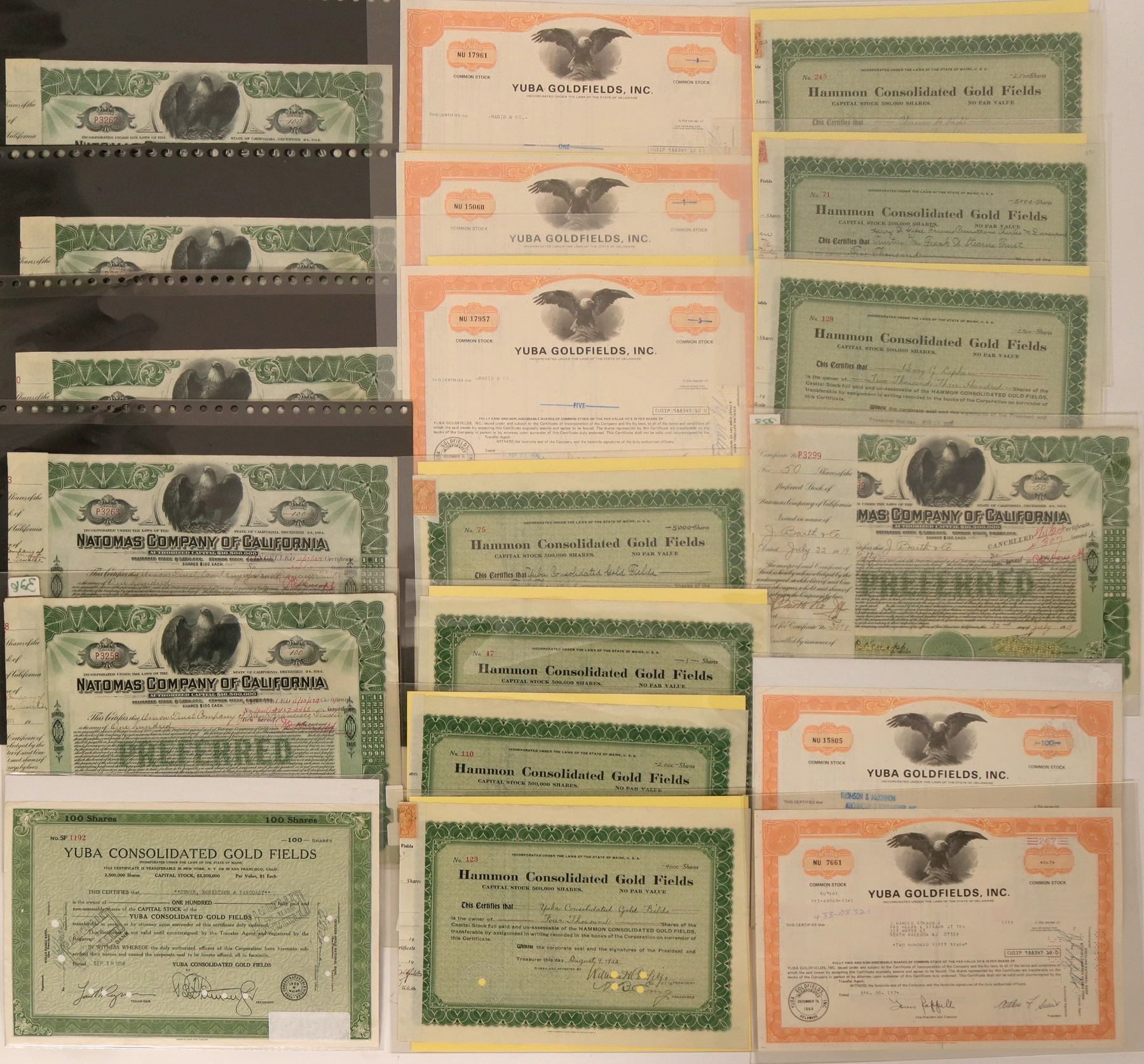 A group of 19 mining stock certs including Natomas, Yuba Goldfields Inc and many more. Some are canceled, some unused and some have revenue stamps. A very colorful collection starter set.