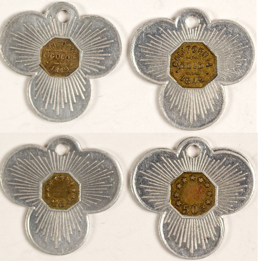 Lot of two encased Cal Gold tokens in shamrock shaped aluminum holders. Each token has "California / Gold / 1849" on obverse, and "50" on reverse. HWAC# 61964 Date: Location: