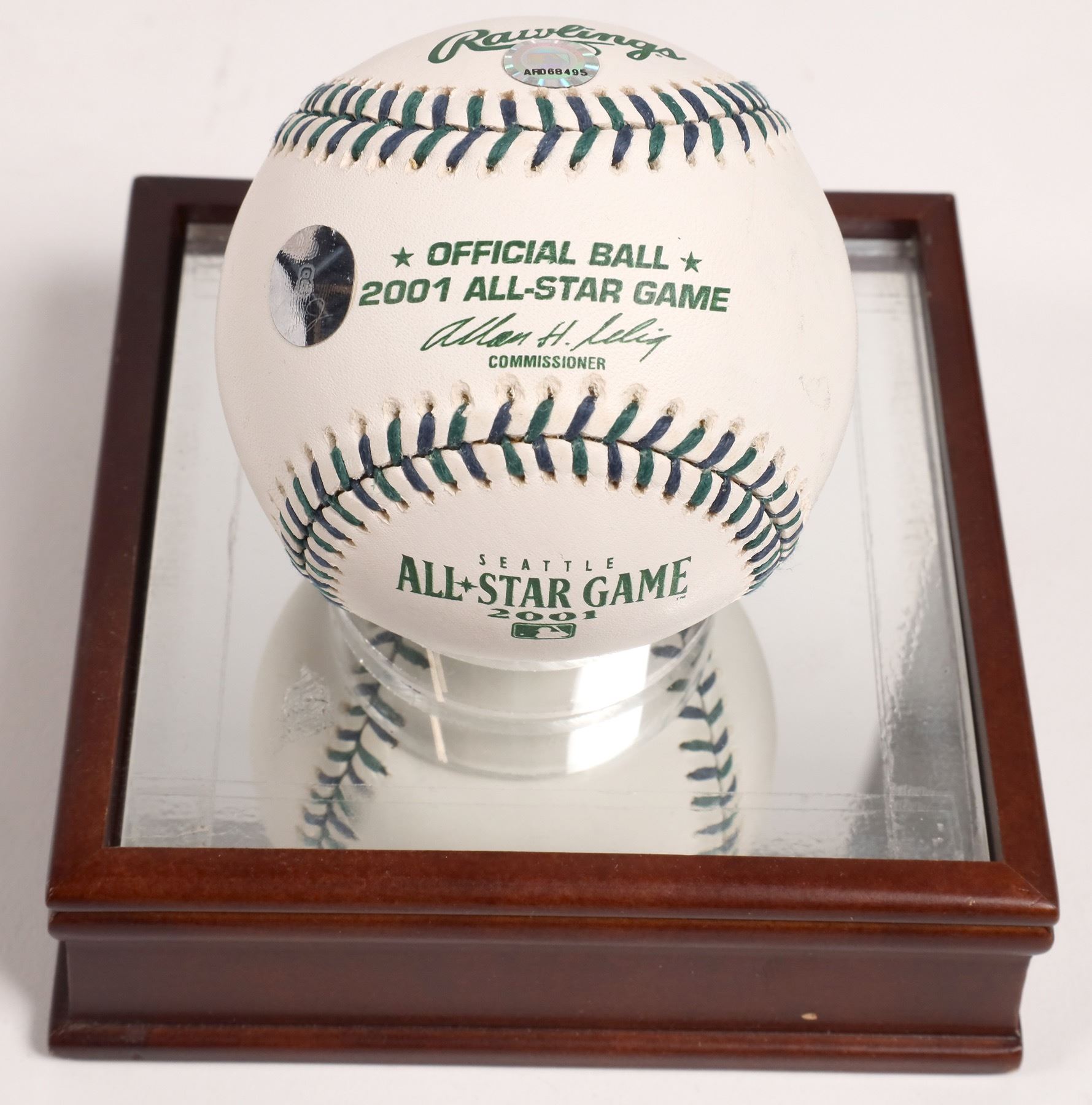 Cal Ripken Jr. autographed 2001 All Star Game ball, #226/2001. 2 hologram stickers on ball. Glass case with dark wood base. 5.25x4.5x4.5". "Calvin Edwin Ripken Jr., nicknamed "The Iron Man", is an American former baseball shortstop and third baseman who played 21 seasons in Major League Baseball for the Baltimore Orioles." from Wikipedia