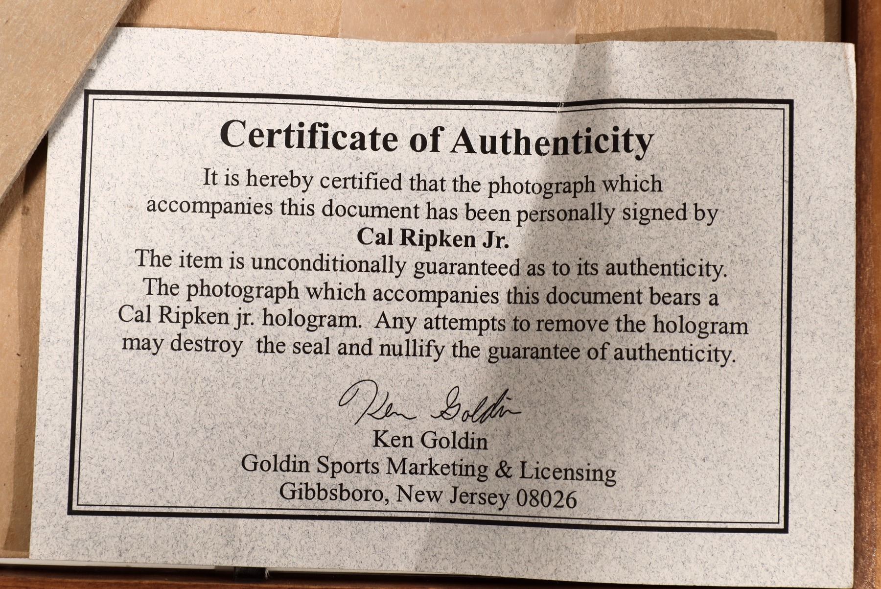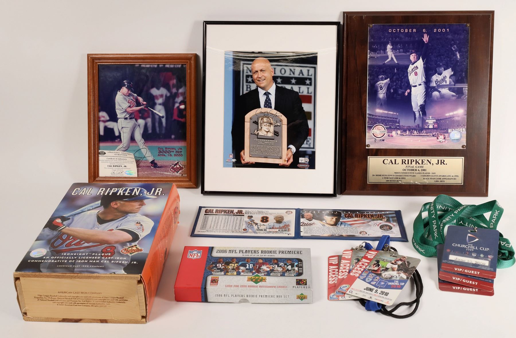 2 different Cal Ripkin Jr. autographed photos-3000th hit, April 15, 2000 with COA 9.5x7.5", 2007 HOF with 2 hologram stickers 9.25x7.5". Brown wood mounted final game #2531/5000 with hologram sticker, 15x12", has some wear. Blue Event Cover , farewell edition, 0075/20001 4.5x8". Sealed wood crate in original binder, Ironeight plaque, #116/2632, 11x8x3.5". 3 each 2009 and 2010 Churchill Cup VIP passes. Upper Deck boxed 2006 NFL Players Rookie Premiere 30 card set. "Calvin Edwin Ripken Jr. (born August 24, 1960), nicknamed "The Iron Man",[1] is an American former baseball shortstop and third baseman who played 21 seasons in Major League Baseball (MLB) for the Baltimore Orioles (1981-2001). One of his position's most offensively productive players, Ripken compiled 3,184 hits, 431 home runs, and 1,695 runs batted in during his career, and he won two Gold Glove Awards for his defense. He was a 19-time All-Star and was twice named American League (AL) Most Valuable Player (MVP). Ripken holds the record for consecutive games played (2,632), having surpassed Lou Gehrig's streak of 2,130 that had stood for 56 years and that many deemed unbreakable. In 2007, he was elected to the National Baseball Hall of Fame in his first year of eligibility with 98.53% of votes, the sixth-highest election percentage ever" from Wikipedia