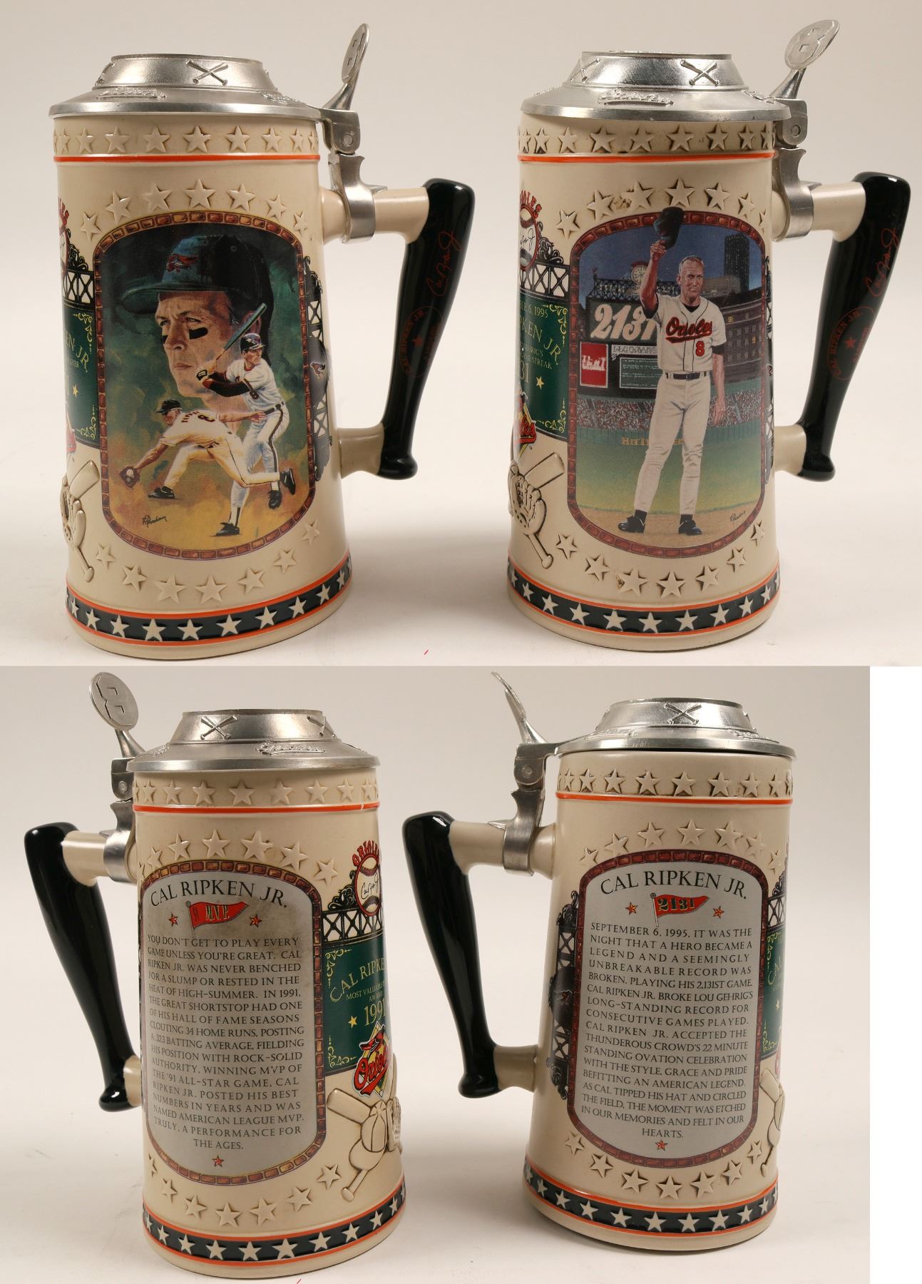 These are two (2) beer steins commemorating Cal Ripken Jr. MVP season of 1991 with the Orioles; and the 1996 "Iron Man-A League of His Own". Made by Longton Crown and issued in 1996, numbered individually. LC #97722 and LC #97721.