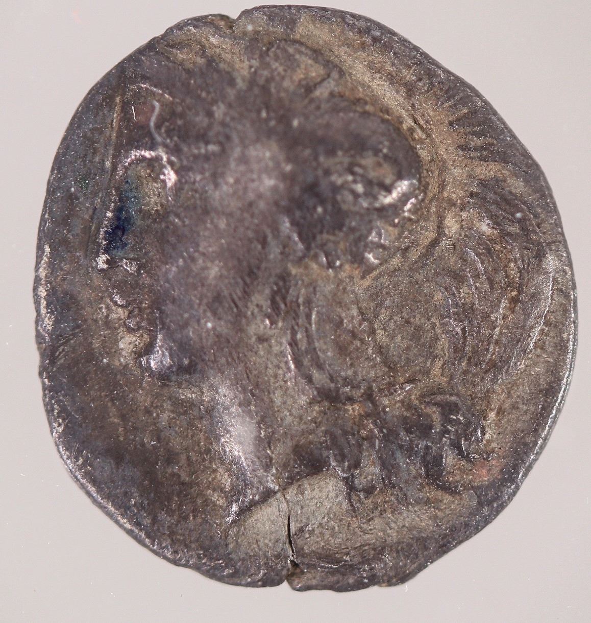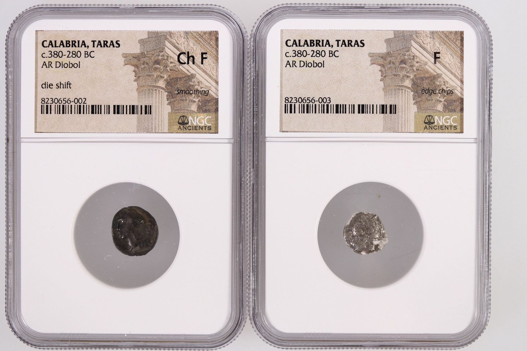 Taras, also known as Tarentum, was an ancient Greek city located in present-day Calabria, Italy, specifically in the area of modern-day Taranto. It was a significant (and the only) Spartan colony and a major center of trade and culture in Magna Graecia. These two AR Diobol are graded F and Ch. F. A diobol is an ancient Greek silver coin denomination with a value of 2 obols or 1/3 drachm, typically weighing about 1.41 - 1.43 grams.