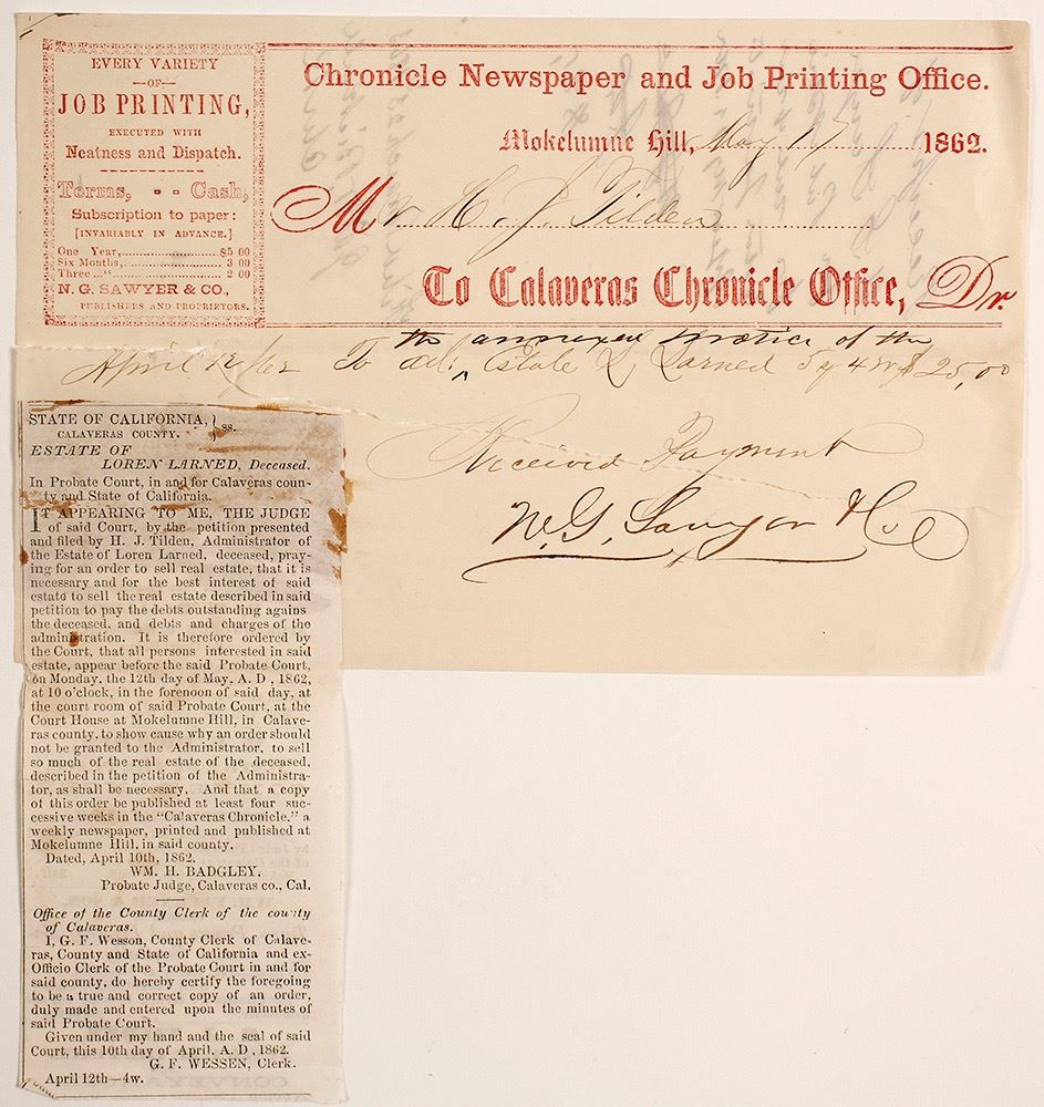 Dateline Mokelumne Hill, May 17th, 1862. Bill for an advertisement of an estate sale. The newspaper ad is attached to the billhead. Loren Larned has died and they cannot find relatives. Therefore they are holding an estate sale. The billhead has a large diagonal tear that needs to be repaired. HWAC# 60069 Date: Location: Mokelumne Hill, California