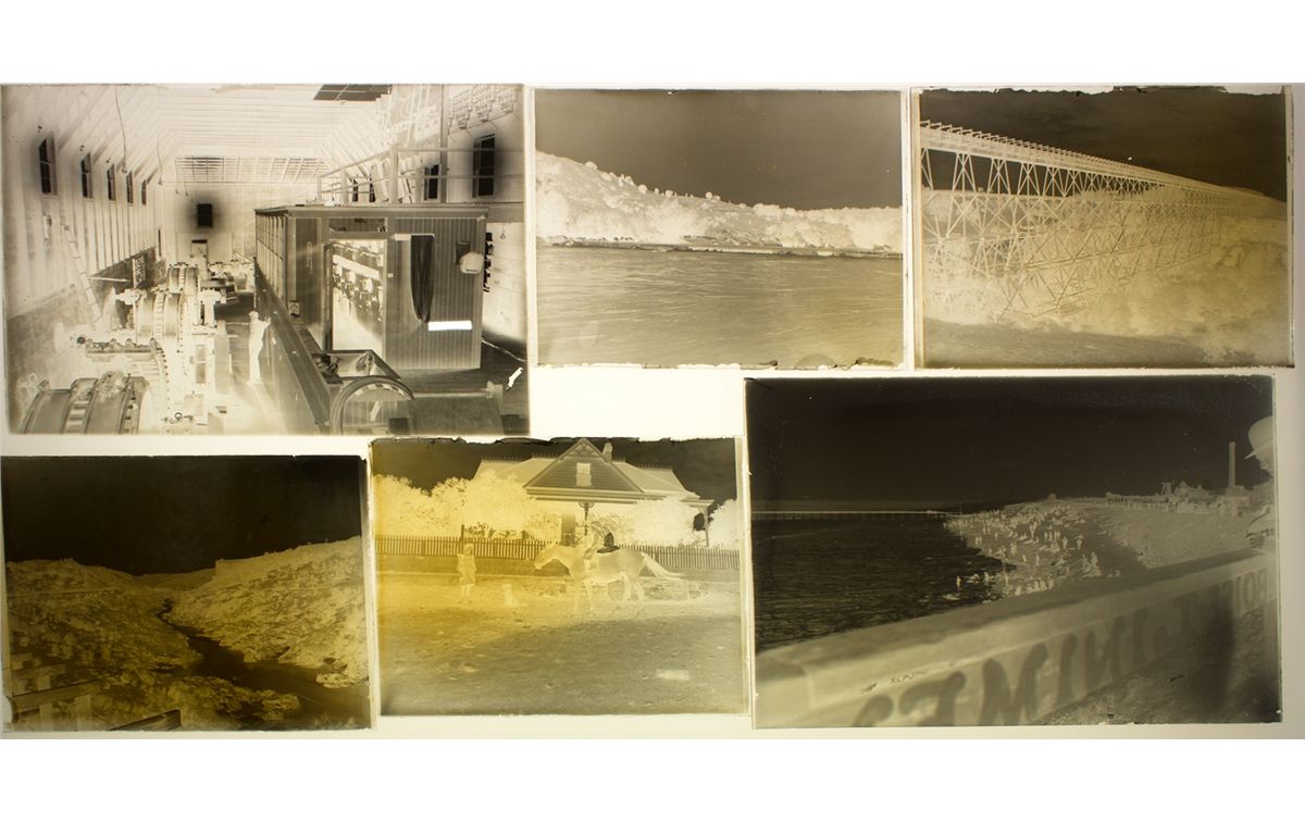 These three boxes of glass negatives are from Archie Stevenot. Eight large negatives (5x7) includes the Pabst Administrative Mansion and the inside of an electrical plant. Many water scenes. Eighteen smaller negatives (4x5): one set says Knights Ferry. Photo of a grave site, etc.