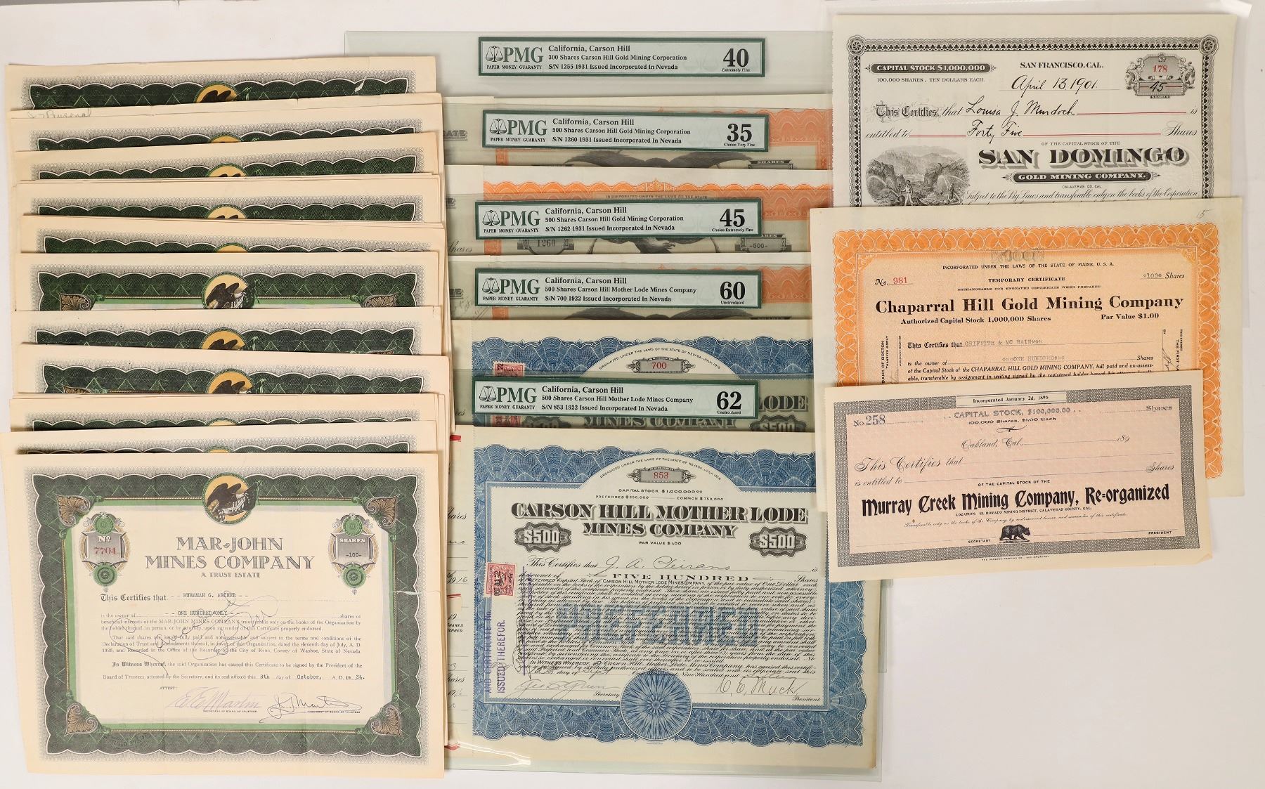 Lot of 30. Includes: San Domingo Gold Mining Co. (1901); Murray Creek Mining Co. (two different unissued); Chaparral Hill Gold Mining Co. (1922); Mar-John Mines Co. (21 stocks, most issued 1920s and 30s); Carson Hill Mother Lode Mines Co. (two $500 bonds, 1916, in PMG holders); and Carson Hill Gold Mining Corp. (3 stocks, 1933, in PMG holders). Please inspect.