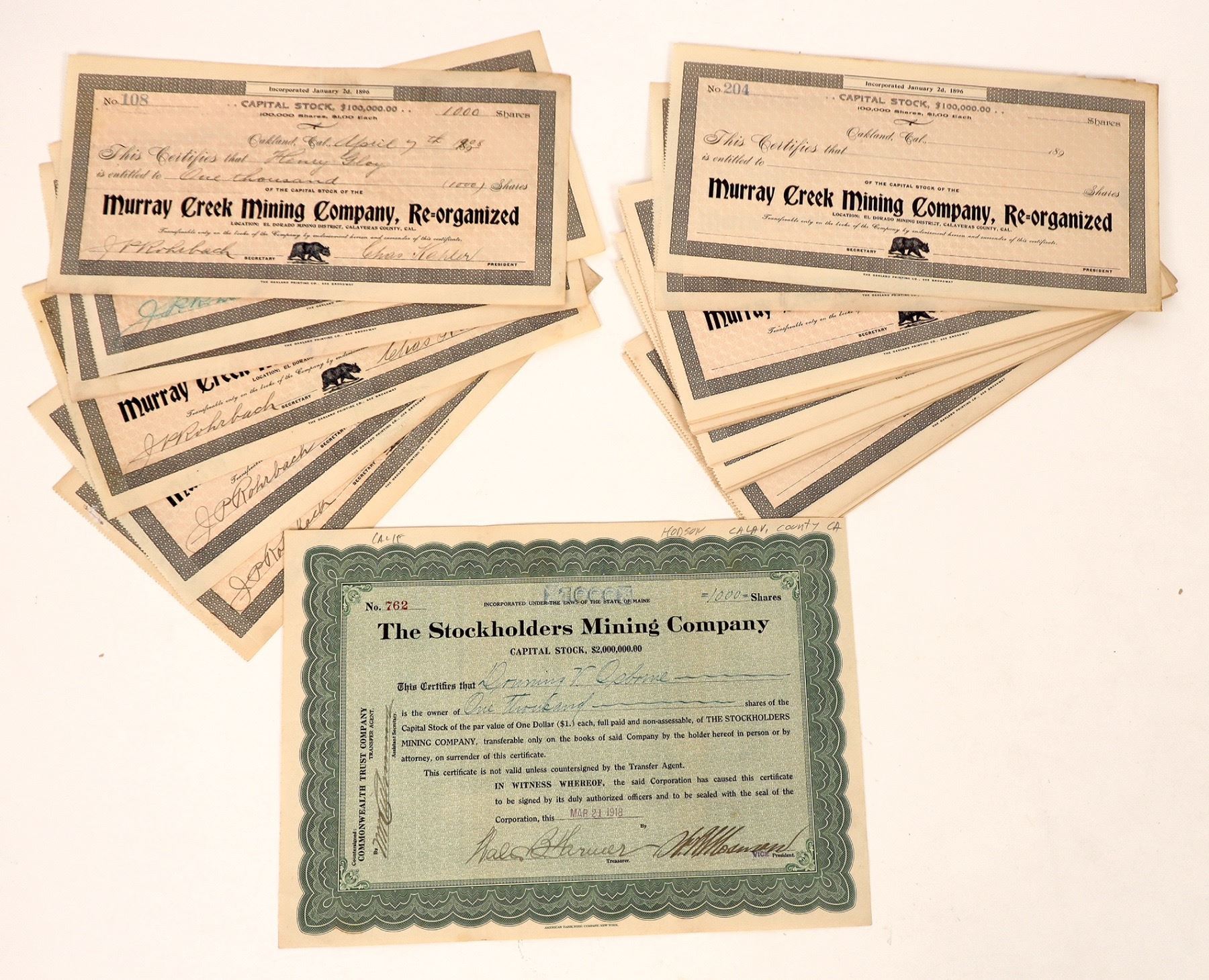 Capital stock certificates from Murray Creek Mining Company (57) and one form The Stockholders Mining Company, dated March 21, 1918. Of the 57 Murray Creek certs, seven were issued and the rest are blank. Both companies are located in Please see photos for more details.