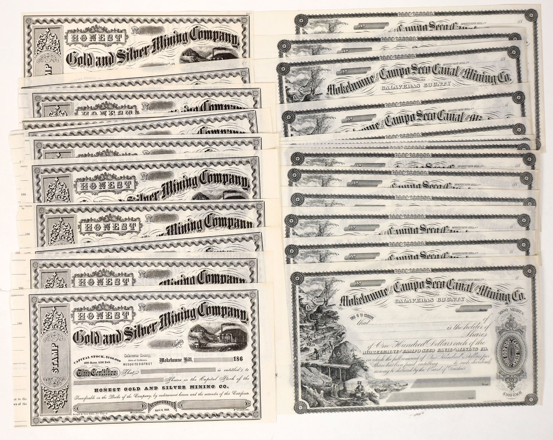 Mokelumne Campo Seco canal Mining Company stock certificates (14) and Honest Gold and Silver Mining Company certificates (6). None are issued. These are in very nice condition. Please see photos for more details.